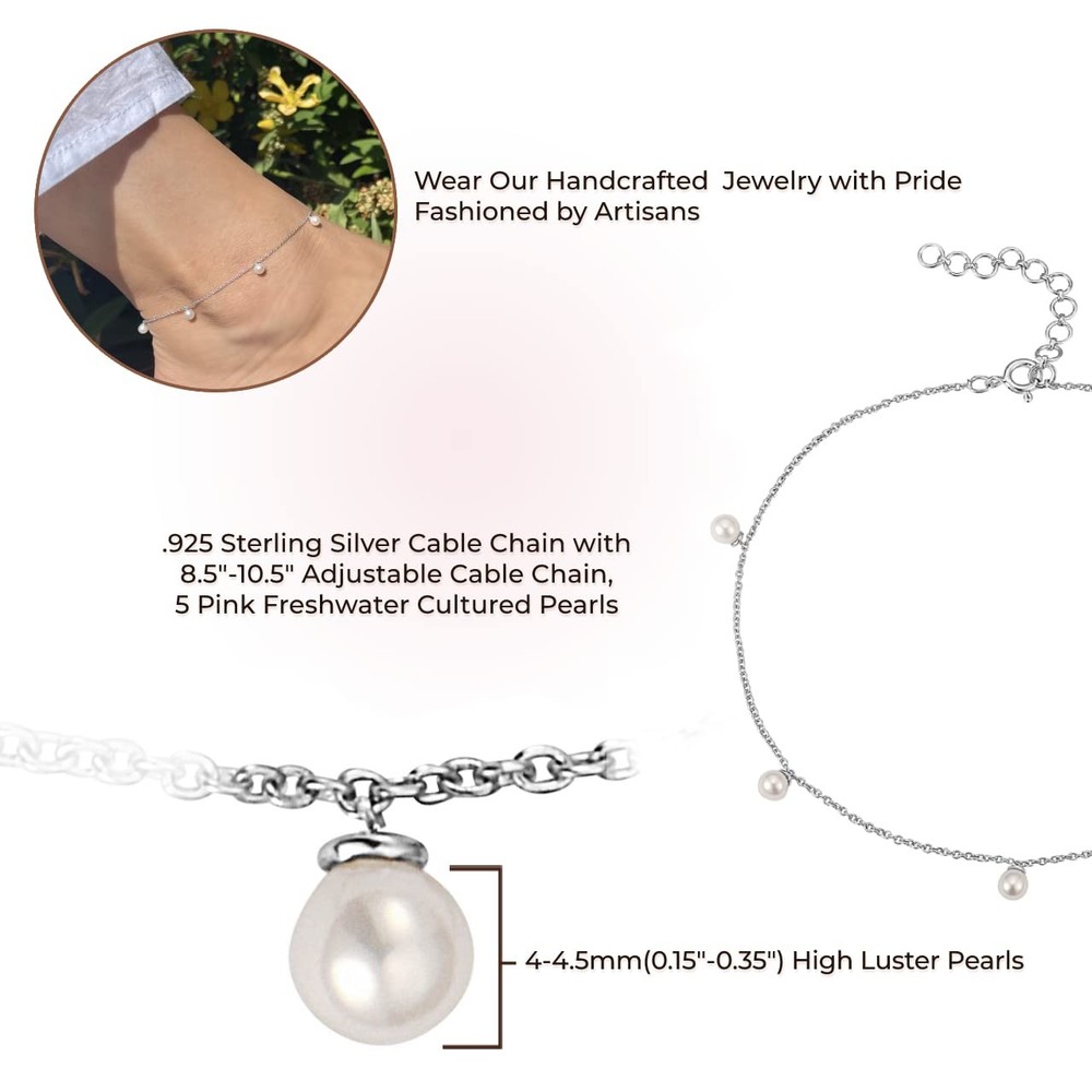 Sterling Silver and Cultured Freshwater White & Pink Pearl Adjustable Tin-cup Anklet (White, 4.0-4.5mm) THE PURITY OF PEARLS: This simply sophisticated satellite-style Anklet pairs perfectly with every outfit. Five genuine 4.0-4.5mm White round cultured pearls punctuate a delicate cable chain in real .925 sterling silver. A spring-ring clasp ensures a secure fit anywhere along with the 1" extender. This lustrous Tin Cup Anklet is the perfect way for a bride to everyday women or a working women. BEAUTIFUL MESMERIZING DESIGN: The Tiny Round Pearls of this anklet are sleek and modern yet classic and elegant in style which will add a luminous glow to your look. Symbolizing purity and transformation, shiny pearls have been coveted for millennia for their rare beauty and connection to exotic seas. This Freshwater Cultured Pearl design is fit for any occasion as daily wearing home, office and wedding. TOP QUALITY JEWELRY: At , we choose only the most Excellent Quality Cultured Pearls that are sustainably harvested by hand. Our hand-picked Shimmering Real Pearls Anklets are truly exceptional AAA+ quality and feature superior luster and uniformity. Wear our Elegant Gemstones lovingly handcrafted jewelry with pride. ELEGANT AND GRACEFUL: These Romantic White Pearls Metal Strand Anklet will ensure that you stand out effortlessly. Each jewelry piece is designed and made right in the heart of New York City, USA by artisans with decades of experience. The 8.5-10.5" adjustable Cable Chain Bead Anklet will become a part of your jewelry set and will enhance your jewelry collection. IDEAL GIFT FOR HER: This Gorgeous Pearls Anklet is perfect for a Valentine's, Anniversary, and Mother’s Day Gift. You can make your bride, bridesmaid, daughter, sister, fiancé, or wife’s Wedding Day, Christmas Day, Birthday, and Hannukah very special with this beautiful present. Each of our products is meticulously inspected and packaged with care to make sure you are getting the very best! We offer a No-Questions-Asked Money-Back Guarantee for 30 days after purchase.