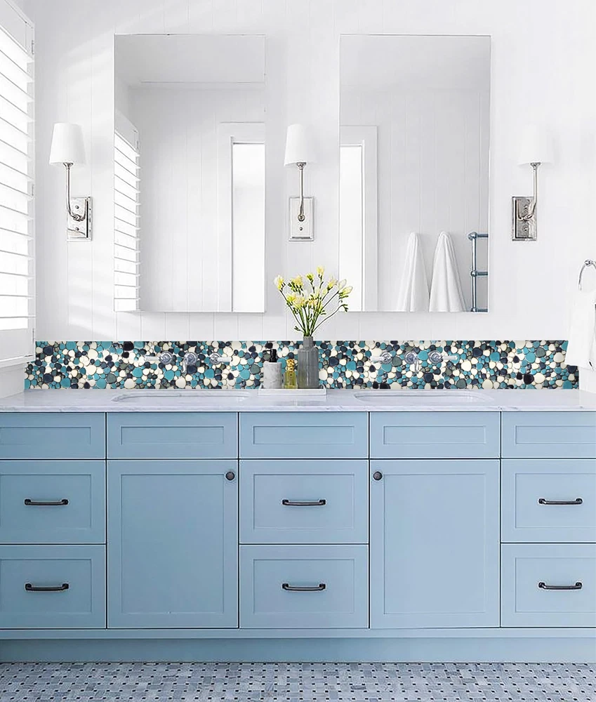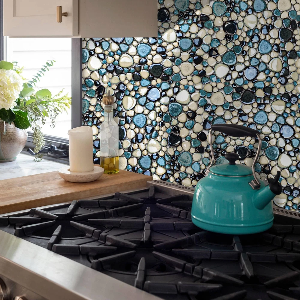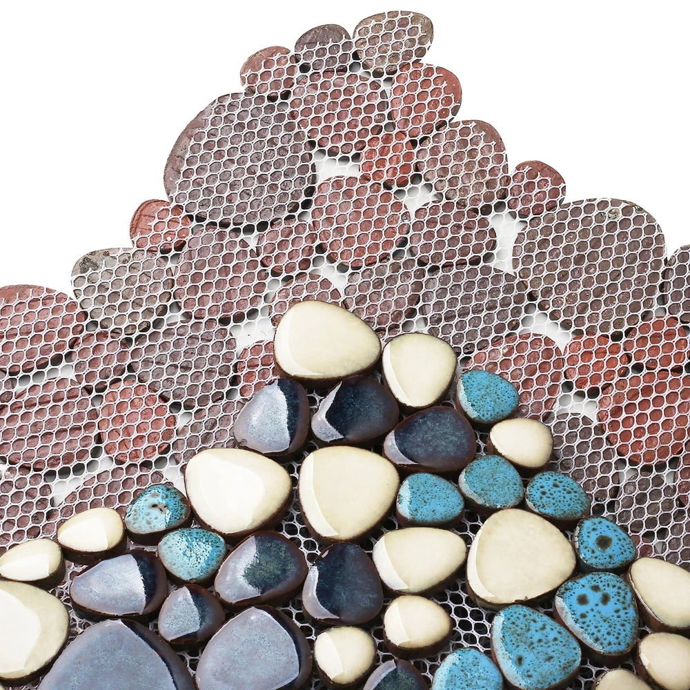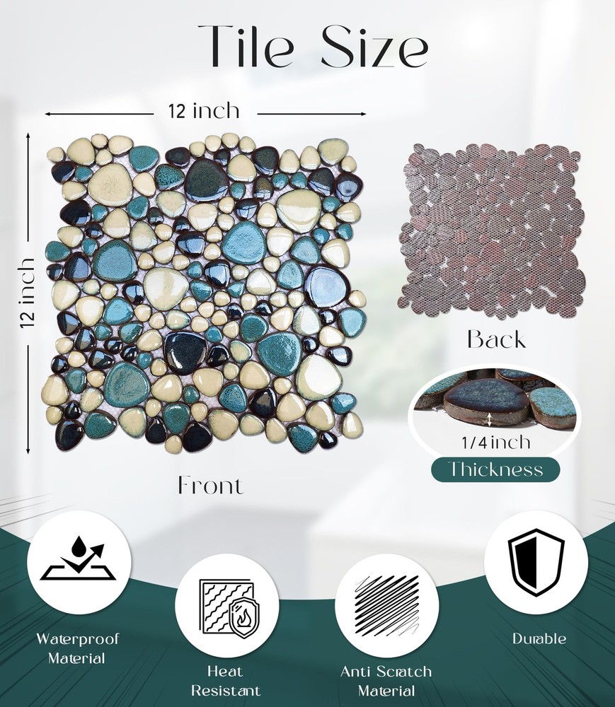 Whole box 5 sheets turquoise ceramic pebble tiles cover 5 sq.ft. Each sheet of the ceramic tile is in 12 x 12 inches, 6 mm thickness, weighted around 2 lbs High-quality material - Pebble mosaic tile is made under a high temperature kiln, smooth and bright glaze, not easy to fade, durable, non-slip, waterproof and high temperature resistance Multipurpose - Suitable for both indoor and outdoor areas, ceramic mosaic tiles can be used as bathroom tiles, shower floor tiles, also for kitchen backsplash, accent wall tiles, bars, spa, swimming pool, etc Easy to cut - Mosaic adheres to a durable mesh backing that can be cut to the desired size. Not peel and stick tiles Easy to clean and maintain - Pebble tiles are stain resistant, once there is a stain, just wipe with a damp cloth to clean About Installation - All mosaic tiles product should be sealed after grouting for best result. Once installed, it will last a lifetime with no peeling issues Meticulous service - Sturdy, durable, non-polluting, and only the best quality ceramic materials are used, as we check the tiles for defects before shipment Eye-catching design - The pebble design and turquoise color of the tile create an eye-catching and unique appearance that can enhance any interior or exterior design Environmentally friendly - Porcelain tiles are made from sustainable materials and can be recycled, making them an environmentally friendly choice Sincere reminder - It is recommended that you order at least 10% more in total square footage of tile to account for overages due to cutting mistakes and tile pattern fit Product size - Each sheet of the ceramic tile is in 12 x 12 inches, 6 mm thickness, weighted around 2 lbs. Whole box 5 pebble tiles cover 5 sq.ft High-quality material - Blue tile are glazed porcelain tile which designed as pebble shapes, pebble tile is made under a high temperature kiln, smooth and bright glaze, not easy to fade, durable, non-slip, waterproof and high temperature resistance Easy to cut and install - The porcelain pieces are adhered to a durable mesh backing to make these mosaic floor tiles easy to install. NOT peel and stick. Once installed, it lasts lifetime, no falling off issues. The back mesh is made of plastic fibers and can be cut to fit the size required Multipurpose - It has a uniform shade variation and glossy glazed surface finish that looks beautiful in any room. Suitable for both indoor and outdoor areas, pebble tiles can be used as bathroom tiles, also for kitchen wall backsplash, bars, spa, swimming pool and so on Meticulous service - It is strong, durable, contamination free, and only the best quality tiles are used as our tiles are inspected for blemishes before shipment. Ceramic Mosaic Usage: Suitable for both indoor and outdoor areas, ceramic tiles can be used as bathroom tiles, shower floor tiles, kitchen backsplash tiles, fireplace tiles, accent wall tiles, bars tiles, spa tiles, pool tiles, and swimming pool tiles, etc. Their smooth, easy-to-clean surface of the ceramic mosaic tile ensures maintenance is a breeze, making them perfect for high-traffic areas like kitchens and bathrooms. which makes them perfact be used as floor tiles and wall tiles, like bathroom sink tiles waterproof, bathroom shower accent tile, bathroom wall tiles for shower. The Pebble tiles can also be used as outdoor ceramic tile, such as outdoor floor tiles, outdoor shower tiles, outdoor stone wall tiles, garden path stone pebbles. These's no slippy issue after grout. It's safe to use the pebble stone tile as non slip floor tiles for bathroom shower. This porcelain flooring tile mosaic is unique designed. The special aqua teal blue color ceramic tile is a great match for all your deco style.
