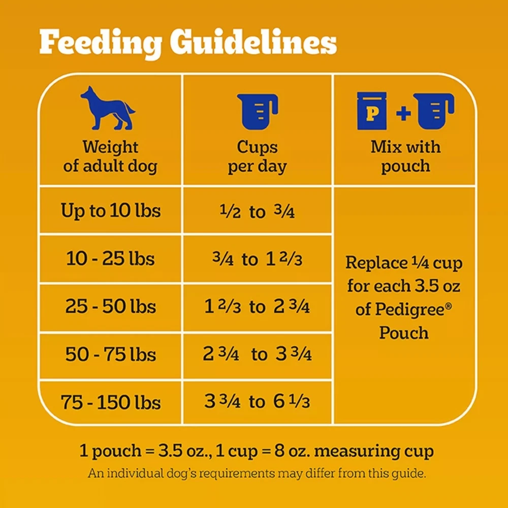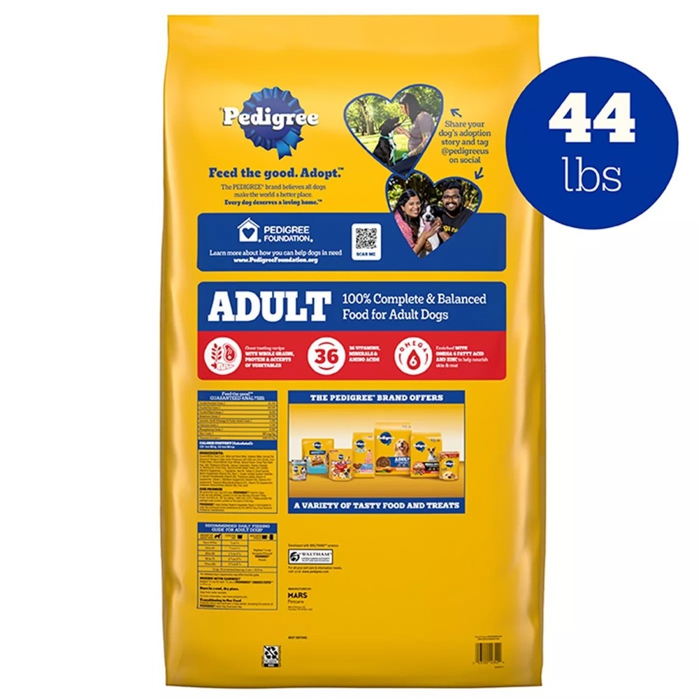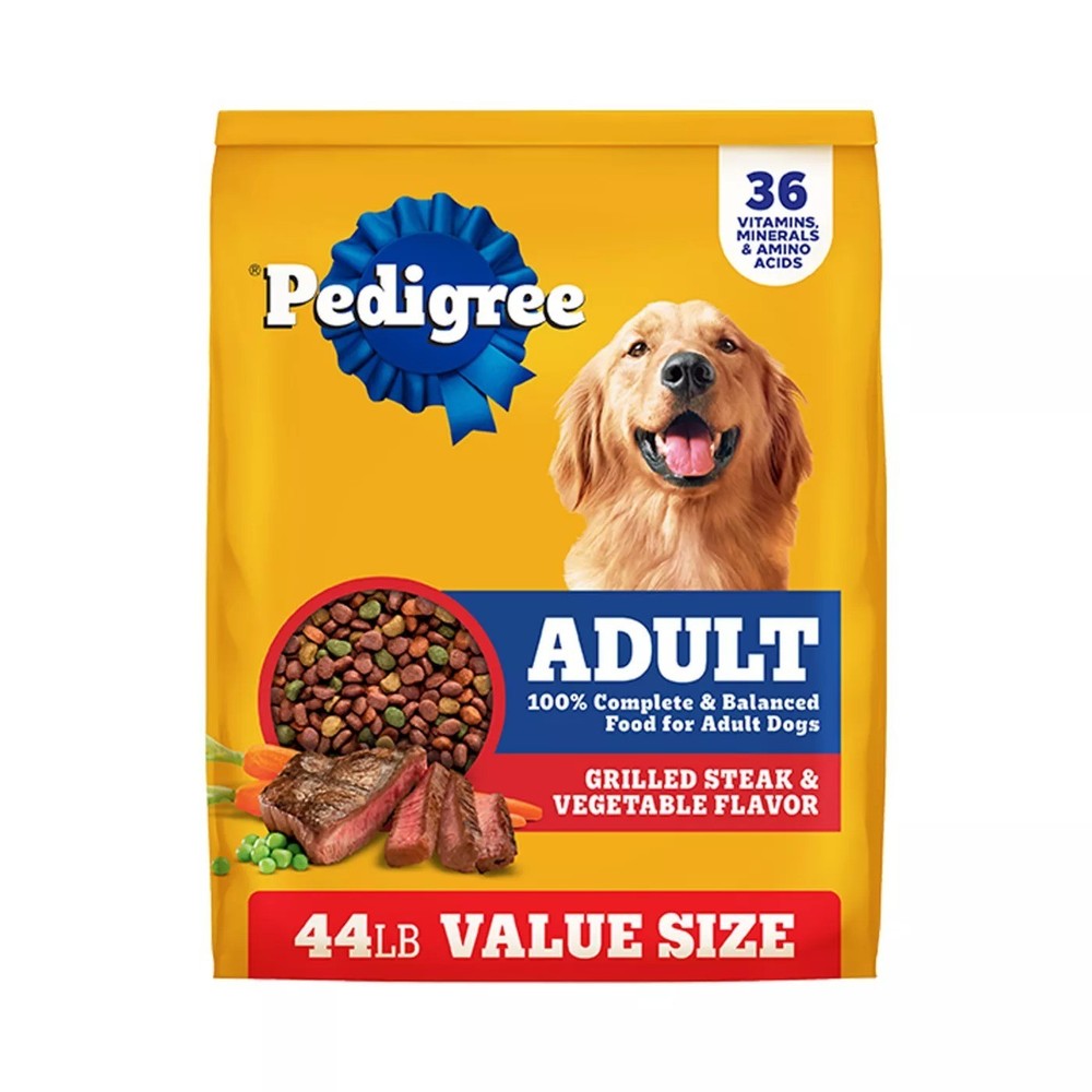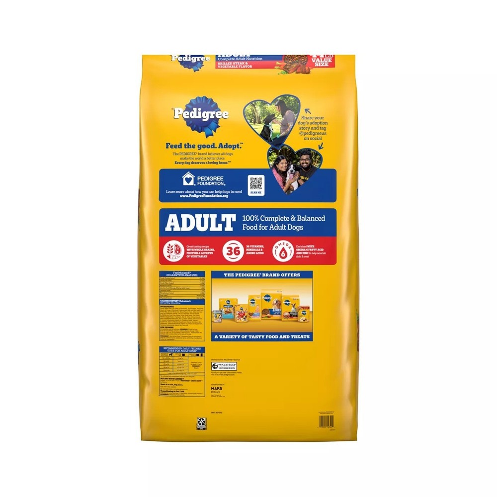 Pedigree Adult Dry Dog Food 44 lb x 3 Pack Steak & Vegetable Complete Nutrition Description : Dogs bring out the good in us. Pedigree dog food brings out the good in them. Express your love for your dog by serving Pedigree Complete Nutrition Adult Dry Dog Food, Grilled Steak & Vegetable Flavor recipe. Made with only natural flavors for great taste in every bowl, this healthy dog food recipe supports their everyday health and natural vitality and is formulated with 36 vitamins, minerals, and amino acids. It also contains high–quality protein to support lean muscles, prebiotic fiber to support healthy digestion, and Omega 6 Fatty Acid and Zinc to help nourish a healthy skin and coat. This recipe is made in the USA with the finest ingredients from around the world. With no high fructose corn syrup, artificial flavors, or added sugars, Pedigree Complete Nutrition Adult Dry Dog Food, Grilled Steak & Vegetable Flavor shows your dog that you care and have great taste. Features & Benefits: Complete and Balanced: Pedigree Adult DryDog Food Grilled Steak & Vegetable Flavor is 100%, complete and balanced food for adult dogs, bringing a nutritious meal to your pet. Supports Everyday Health: This dry dog food recipe is made with 36 vitamins, minerals, and amino acids to support your dog's health and vitality. High Quality Protein: Supports lean muscle with high–quality protein. Highly Digestible Dog Food Recipe: Pedigree Adult Dry Dog Food Grilled Steak & Vegetable recipe is made with only natural flavors and includes prebiotic fibers to support healthy digestion. Supports Healthy Skin and Coat: This dry dog food recipe is enriched with Omega 6 Fatty Acid and Zinc to help nourish a healthy skin and coat. Supports Immune Health: This dry dog food recipe fortified with vitamins & minerals to support a healthy immune system. Contains one (1) 44 lb. Bag of Pedigree Adult Dry Dog Food, Grilled Steak and Vegetable Flavor. Species: Dog Brand: Pedigree Food Type: Dry Breed Size: All Breed Sizes Life Stage: Adult (1–7 years) Nutritional Benefits: MADE IN THE USA WITH THE FINEST INGREDIENTS FROM AROUND THE WORLD Health Consideration: MADE IN THE USA WITH THE FINEST INGREDIENTS FROM AROUND THE WORLD Great tasting recipe WITH WHOLE GRAINS, PROTEIN & ACCENTS OF VEGETABLES 36 VITAMINS, MINERALS & AMINO ACIDS Enriched WITH OMEGA 6 FATTY ACID, AND ZINC to help nourish skin & coat 100%, COMPLETE & BALANCED FOOD FOR ADULT DOGS NO HIGH FRUCTOSE CORN SYRUP NO ARTIFICIAL FLAVORS NO ADDED SUGAR Flavor: Steak and Vegetable Weight: 44.000 LB Ingredients: Ground Whole Grain Corn, Meat and Bone Meal, Soybean Meal, Animal Fat (Source of Omega 6 Fatty Acids [Preserved with BHA and Citric Acid]), Ground Whole Grain Wheat, Corn Protein Meal, Natural Flavor, Dried Plain Beet Pulp, Salt, BHA (Preservative), Citric Acid (Preservative), Potassium Chloride, Choline Chloride, DL–Methionine, Calcium Carbonate, Dried Peas, Natural Grilled Steak Flavor, Zinc Sulfate, Vitamin E Supplement, L–Tryptophan, Red 40, Dried Carrots, Yellow 6, Niacin Supplement (Vitamin B3), Blue 2, D–Calcium Pantothenate (Vitamin B5), Copper Sulfate, Sodium Selenite, Potassium Iodide, Yellow 5, Vitamin A Supplement, Riboflavin Supplement (Vitamin B2), Vitamin B12 Supplement, Thiamine Mononitrate (Vitamin B1), Vitamin D3 Supplement, Pyridoxine Hydrochloride (Vitamin B6), Folic Acid.