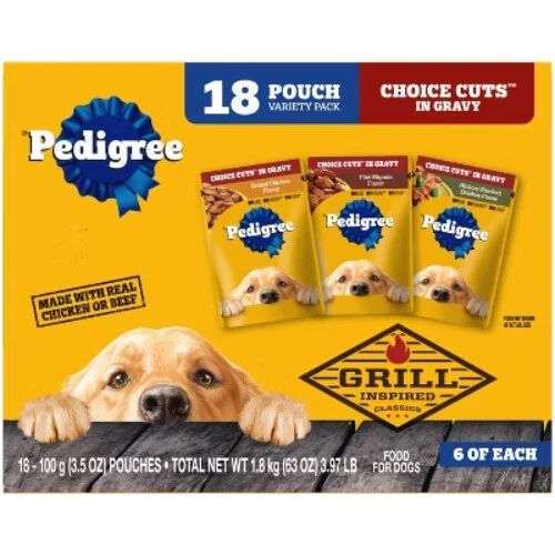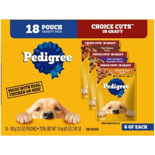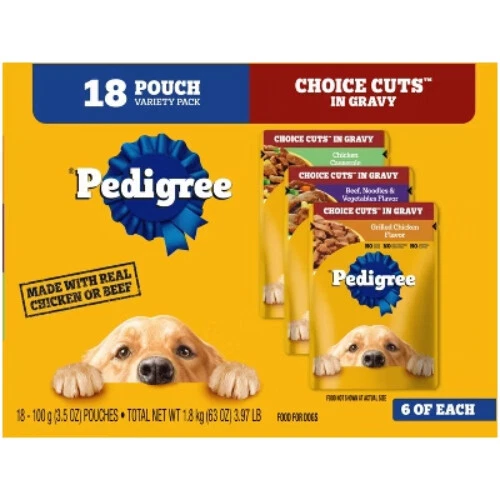 Highlights 100% Complete and Balanced For Adult Dogs: Pedigree Choice Cuts In Gravy Adult Soft Wet Dog Food 18-Count Variety Pack is 100% complete and balanced food for adult dogs, keeping your dog full and happy. Quality Recipe: This soft dog food contains no added sugar, no high fructose corn syrup, and no artificial flavors. Mix-it-Up: These wet dog food recipes can be served as a topper, mixed with dry dog food, or enjoyed as a complete meal for adult dogs, bringing your dog a variety of ways to enjoy. Zero Waste to Landfill: Pedigree Choice Cuts In Gravy Adult Soft Wet Dog Food 18-Count Variety Pack is made in factories committed to zero waste to landfill. 18-Count: Pedigree Choice Cuts In Gravy Adult Soft Wet Dog Food Variety Pack contains six (6) 3.5 oz. Pouches of Hickory Smoked Chicken Flavor, six (6) Filet Mignon Flavor, and six (6) Grilled chicken Flavor. Description Treat your dog to the delicious Grill Inspired Classics! PEDIGREE CHOICE CUTS IN GRAVY adult wet dog food gives dogs the taste they crave with the nutrition they need. This variety pack comes with three flavors your pup will love: Hickory Smoked Chicken, Filet Mignon, and Grilled Chicken. These flavorful, hearty cuts in a delectable gravy sauce make a tasty meal for dogs of all sizes and provide the perfect balance of vitamins and minerals with no artificial flavor, no added sugar, and no high fructose corn syrup. Each recipe is 100% complete and balanced for adult canines, so you know they’re getting the most out of their diet. Serve as a topper, a mixer with dry dog food, or a complete meal! Feed your dog nutritious food for a healthy, happy life with PEDIGREE Pouches.