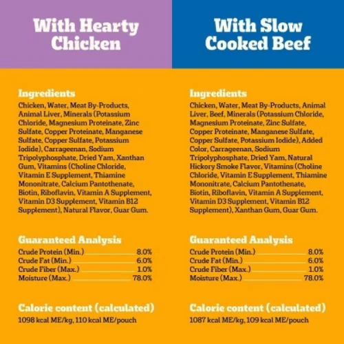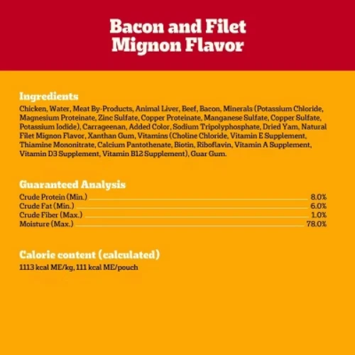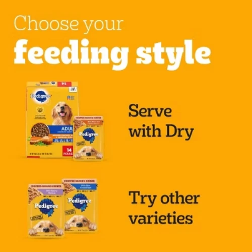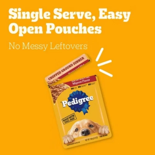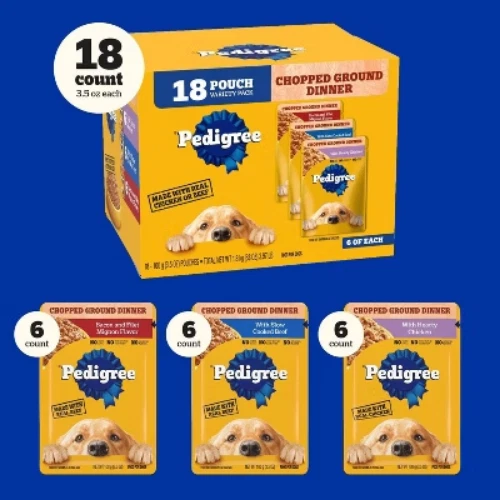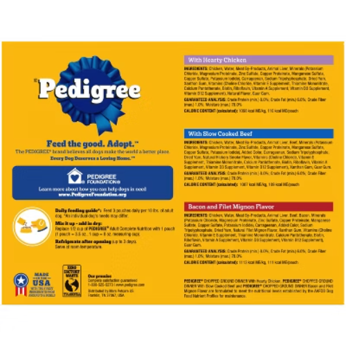 Important Note for Our Valued Customers: To offer you the best prices with free shipping, we occasionally experience shipping delays. If this happens, we’ll notify you immediately, issue a full refund, and invite you to place a new order at your convenience. To keep costs low, we sometimes reuse branded packaging boxes for shipments—we appreciate your understanding if you receive your order in repurposed packaging. Rest assured, all products we sell are 100% brand new, unopened, and freshly manufactured, including pet food and human-grade items, with a minimum 8-month shelf life remaining. If any issues arise, please contact us first—we’re committed to resolving them quickly. If you’re not completely satisfied, we offer a full refund with no hassle. Thank you for your trust and support! Description PEDIGREE CHOPPED GROUND DINNER is the wet dog food that delivers the taste dogs crave with the nutrition they need. This variety pack features three delicious flavors: With Hearty Chicken, With Slow Cooked Beef, and Bacon and Filet Mignon Flavor. This easy-to-chew ground texture makes a tasty meal for adult dogs of all sizes and provides the perfect balance of vitamins and minerals with no artificial flavor, no added sugar, and no high fructose corn syrup. Each dog wet food recipe is 100% complete and balanced for adult canines, so you know they’re getting the most out of their diet. Serve as a topper, a mixer with dry dog food, or a complete meal! Feed your dog nutritious food for a healthy, happy life with PEDIGREE Pouches. highlights 100% Complete and Balanced Food For Adult Dogs: Pedigree Chopped Ground Dinner Dog Food 18-Count Bacon Filet Mignon Variety Pack is 100% complete and balanced food for adult dogs, keeping your dog full and happy. Quality Recipe: These soft dog food recipes contain no added sugar, no high fructose corn syrup, and no artificial flavors. Mix-it-Up: These wet dog food recipes can be served as a topper, mixed with dry dog food, or as a complete meal for adult dogs, bringing your dog a variety of ways to enjoy. Zero Factory Waste to Landfill: Pedigree Chopped Ground Dinner Dog Food 18-Count Bacon Filet Mignon Variety Pack is made in factories committed to zero waste to landfill. 18-Count: Pedigree Chopped Ground Dinner Dog Food 18-Count Bacon Filet Mignon dog wet food variety pack contains six (6) 3.5 oz. Pouches of With Hearty Chicken, six (6) With Slow Cooked Beef, and six (6) Bacon, filet Mignon Flavors. Amount Bacon and Filet Mignon Flavor: % Daily Value* Crude Protein (Min) 8% Crude Fat (Min) 6% Crude Fiber (Max) 1% Moisture (Max) 78% * Percentage of Daily Values are based on a 2,000 calorie diet. Amount With Slow Cooked Beef: % Daily Value* Crude Protein (Min) 8% Crude Fat (Min) 6% Crude Fiber (Max) 1% Moisture (Max) 78% * Percentage of Daily Values are based on a 2,000 calorie diet. Amount With Hearty Chicken: % Daily Value* Crude Protein (Min) 8% Crude Fat (Min) 6% Crude Fiber (Max) 1% Moisture (Max) 78% * Percentage of Daily Values are based on a 2,000 calorie diet. Ingredients: with hearty chicken - chicken, sufficient water for processing, meat by-products, animal liver, minerals (potassium chloride, magnesium proteinate, zinc sulfate, copper proteinate, manganese sulfate, copper sulfate, potassium iodide), carrageenan, sodium tripolyphosphate, dried yam, xanthan gum, vitamins (choline chloride, vitamin e supplement, thiamine mononitrate, calcium pantothenate, biotin, riboflavin supplement, vitamin a supplement, vitamin d3 supplement, vitamin b12 supplement), natural flavor, guar gum, sodium nitrite (for color retention), with slow cooked beef - chicken, sufficient water for processing, meat by-products, animal liver, beef, minerals, minerals (potassium chloride, magnesium proteinate, zinc sulfate, copper proteinate, manganese sulfate, copper sulfate, potassium iodide), added color, carrageenan, sodium tripolyphosphate, dried yam, natural smoke flavor, vitamins (choline chloride, vitamin e supplement, thiamine mononitrate, calcium pantothenate, biotin, riboflavin supplement, vitamin a supplement, vitamin d3 supplement, vitamin b12 supplement), xanthan gum, guar gum, sodium nitrite, bacon and filet mignon flavor - chicken, sufficient water for processing, meat by-products, animal liver, beef, bacon, minerals (potassium chloride, magnesium proteinate, zinc sulfate, copper proteinate, manganese sulfate, copper sulfate, copper proteinate, manganese sulfate, copper sulfate, potassium iodide), carrageenan, added color, sodium tripolyphosphate, dried yam, natural filet mignon flavor, xanthan gum, vitamins (choline chloride, vitamin e supplement, vitamin d3 supplement, vitamin b12 supplement), guar gum, sodium nitrite (for color retention)