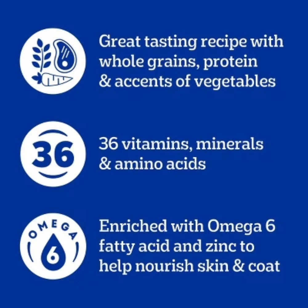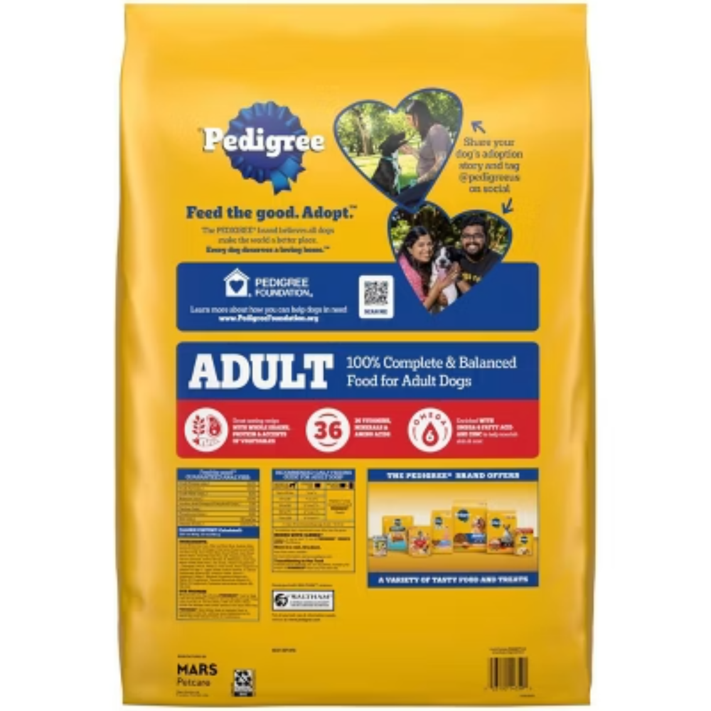 Description Dogs bring out the good in us. Pedigree brings out the good in them. Express your love for your dog by serving Pedigree Complete Nutrition Adult Dry Dog Food, Grilled Steak & Vegetable Flavor. This 100% complete and balanced adult dry dog food recipe is great-tasting and contains whole grains, protein, and accents of vegetables, bringing your dog a meal with quality nutrition that keeps them happy. To support your dog’s health and vitality, this dry dog food recipe is formulated with 36 vitamins, minerals, and amino acids. It also contains Omega 6 Fatty Acid and Zinc to help nourish a healthy skin and coat. With no high fructose corn syrup, artificial flavors, or added sugars, Pedigree Complete Nutrition Adult Dry Dog Food, Grilled Steak & Vegetable Flavor shows your dog that you care…and have great taste. highlights Great Tasting: Pedigree Complete Nutrition, Adult Dry Dog Food, Grilled Steak & Vegetable Flavor is a great-tasting dry dog food recipe with whole grains, protein, and accents of vegetables. Quality Nutrition: This dry dog food recipe is made with 36 vitamins, minerals, and amino acids to support your dog’s health and vitality; Crafted with no high fructose corn syrup, artificial flavors, or added sugar. Supports Healthy Skin and Coat: This dry dog food recipe is enriched with Omega 6 Fatty Acid and Zinc to help nourish a healthy skin and coat. Complete and Balanced: Pedigree Complete Nutrition Adult Dry Dog Food, Grilled Steak & Vegetable Flavor is 100% complete and balanced food for adult dogs, bringing a nutritious meal to your pet. Make it a Merry Pet Christmas for your pet with flavors crafted for holiday joy! Deck the bowls and fill them with our real steak and beef ingredients! Contains one (1) 18 lb. Bag of Pedigree Complete Nutrition Adult Dry Dog Food, Grilled Steak & Vegetable Flavor. Ingredients: ground whole grain corn, meat and bone meal, soybean meal, animal fat (source of omega 6 fatty acids [preserved with bha and citric acid]), ground whole grain wheat, corn protein meal, natural flavor, dried plain beet pulp, salt, bha (preservative), citric acid (preservative), potassium chloride, choline chloride, dl-methionine, calcium carbonate, dried peas, natural grilled steak flavor, zinc sulfate, vitamin e supplement, l-tryptophan, red 40, dried carrots, yellow 6, niacin supplement (vitamin b3), blue 2, d-calcium pantothenate (vitamin b5), copper sulfate, sodium selenite, potassium iodide, yellow 5, vitamin a supplement, riboflavin supplement (vitamin b2), vitamin b12 supplement, thiamine mononitrate (vitamin b1), vitamin d3 supplement, pyridoxine hydrochloride (vitamin b6), folic acid.