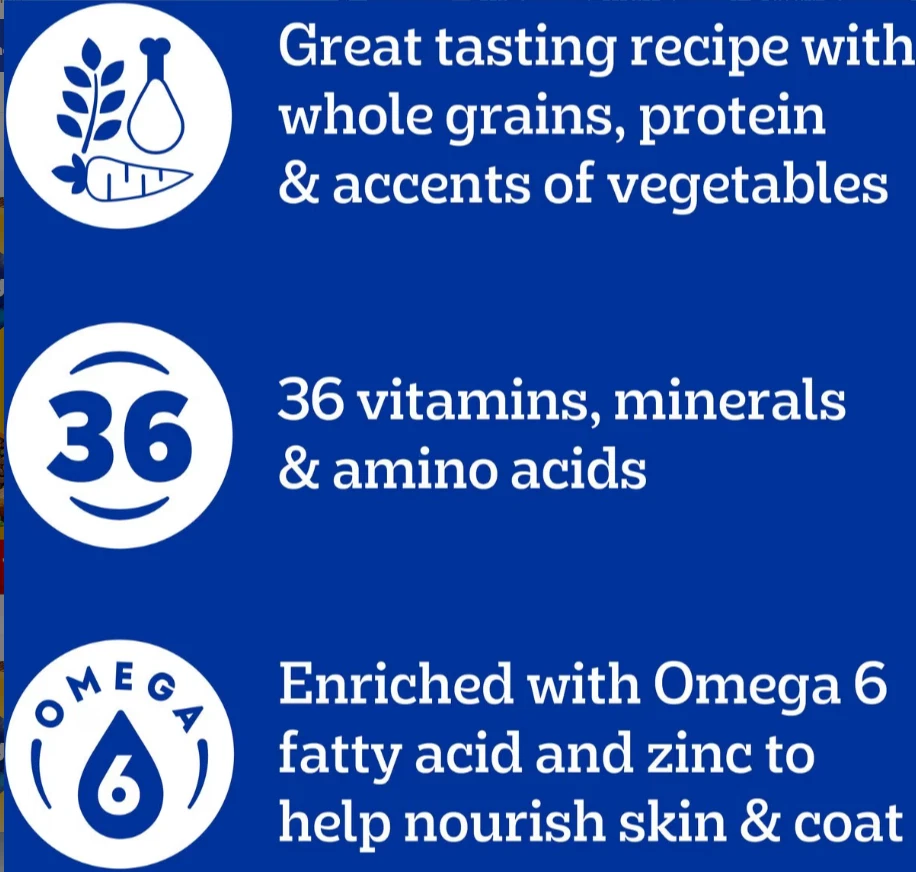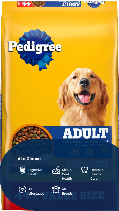 This great-tasting dry dog food recipe comes with whole grains, protein, and accents of vegetables. Made with 36 vitamins, minerals, and amino acids to support your furry friend’s health and vitality. Enriched with omega-6 fatty acids and zinc to help nourish a healthy skin and coat. 100% complete and balanced food for adult dogs, bringing a nutritious meal to your pet. Crafted with no high-fructose corn syrup, artificial flavors, or added sugar. Dogs bring out the good in us; Pedigree brings out the good in them. Express your love for your furry friend by serving Pedigree Complete Nutrition Adult Dry Dog Food, Roasted Chicken & Vegetable Flavor. This 100% complete and balanced adult dry dog food recipe is great tasting and contains whole grains, protein, and accents of vegetables, bringing your canine companion a meal with quality nutrition that keeps them happy. To support your furry loved one’s health and vitality, this dry dog food recipe is formulated with 36 vitamins, minerals, and amino acids. It also contains omega-6 fatty acids and zinc to help nourish a healthy skin and coat. With no high-fructose corn syrup, artificial flavors, or added sugars, Pedigree Complete Nutrition Adult Dry Dog Food, Roasted Chicken & Vegetable Flavor shows your furbaby that you care—and have great taste. Specifications Item Number 362466 Weight 44 pounds Packaging Type Bag Made In United States Sourced From Various Lifestage Adult, All Lifestages Breed Size All Breeds Food Form Dry Food Special Diet With Grain
