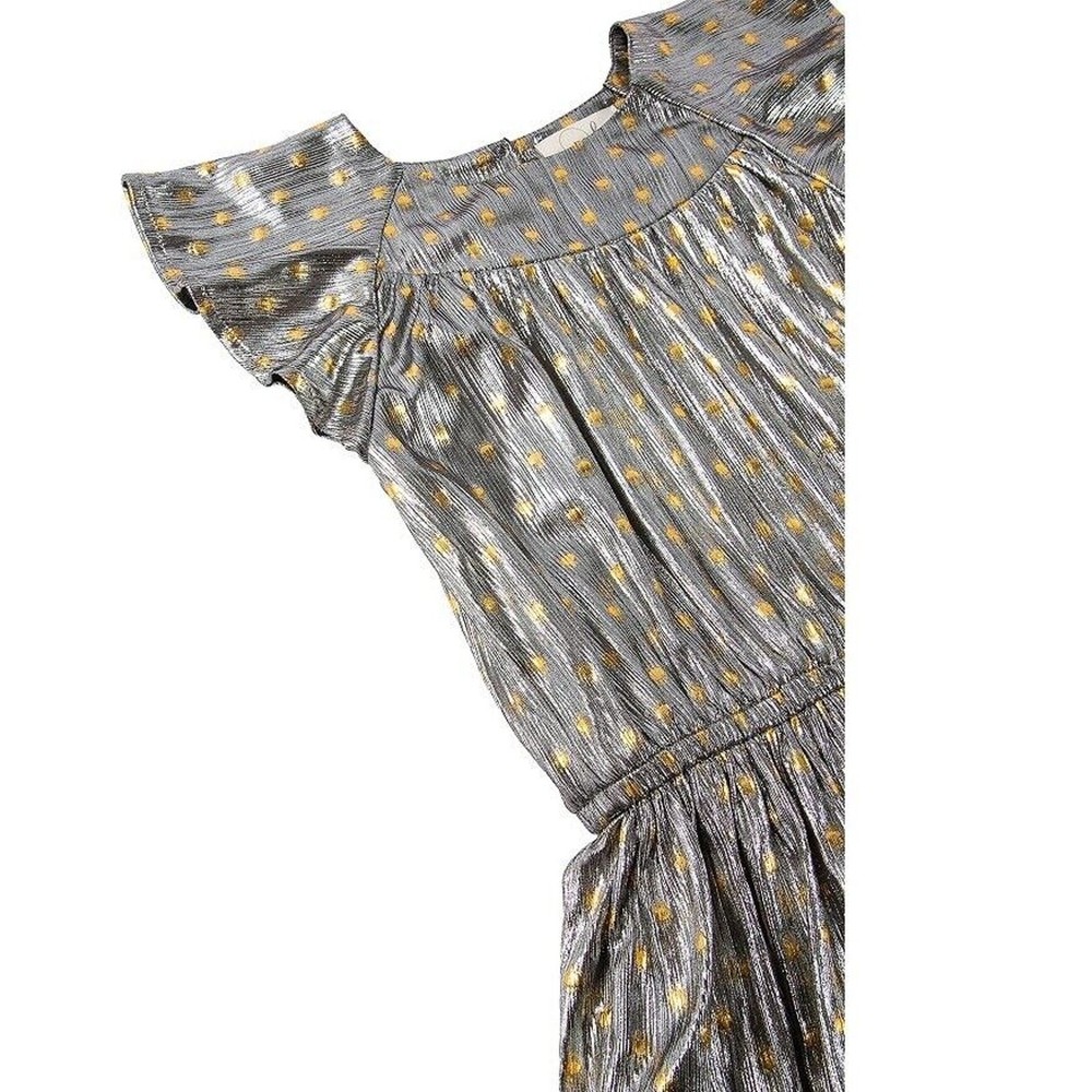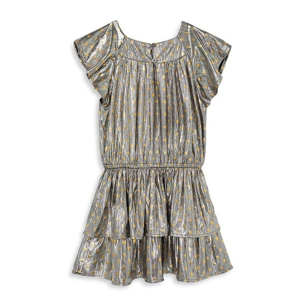 Peek Aren't You Curoius Toddler Girl's Silver Foil Dot Tiered Dress Kids Size 3T New with tags MRSP $54 Metallic dress patterned with golden polka dots Back buttons and keyhole Short sleeves Elastic waist Tiered skirt Allover dot print 100% polyester Machine wash, tumble dry
