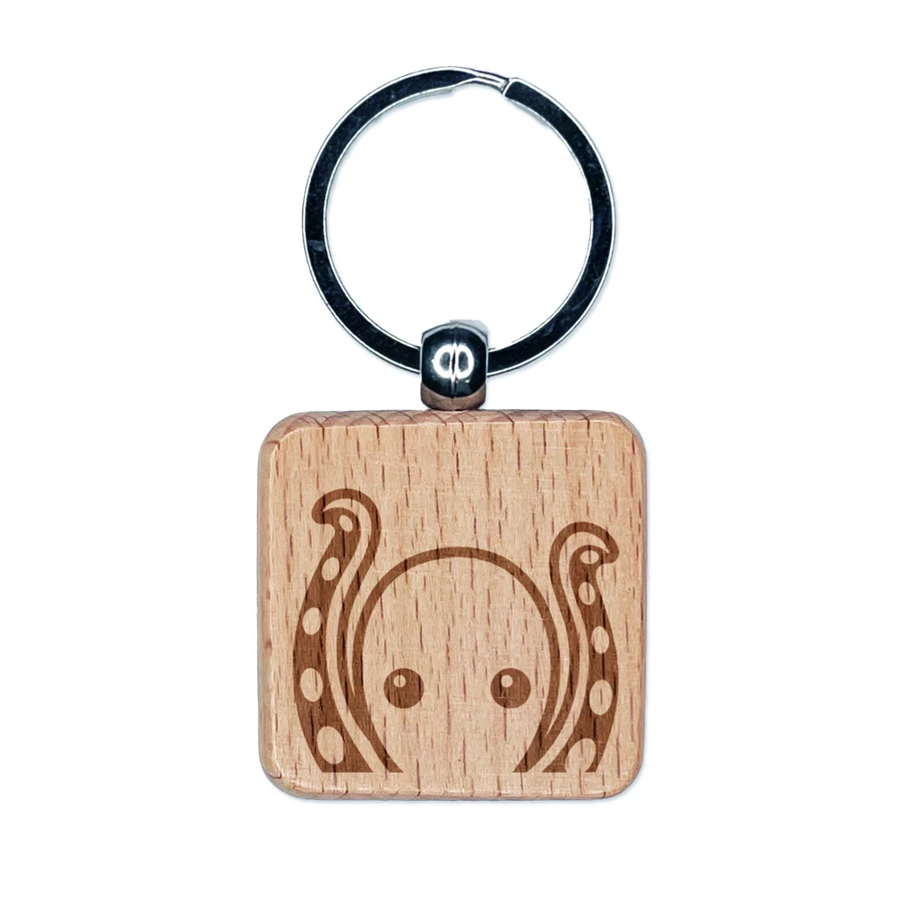 Peeking Octopus Engraved Wood Square Keychain Tag Charm