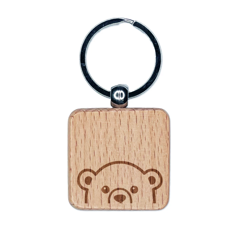 Peeking Polar Bear Engraved Wood Square Keychain Tag Charm