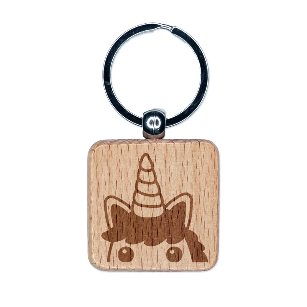 Peeking Unicorn Engraved Wood Square Keychain Tag Charm