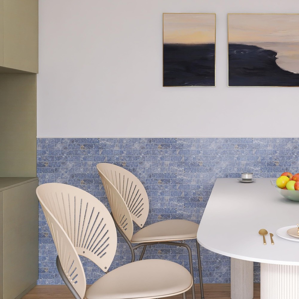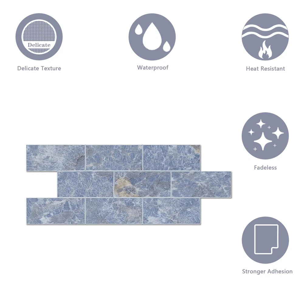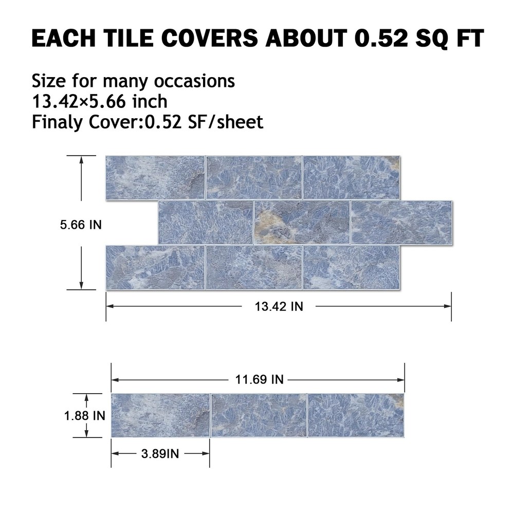 20-Sheet kitchen backsplash Wall Tile Peel and Stick, Subway Adhesive PVC Mosaic Tiles Decorative Backsplash Tiles stick on Bathroom, Fireplace, RV, Marble Blue High-End Quality: 20-sheet self adhesive subway tiles, 13.42"x 5.66"x 0.12" each, cover about 10.4 square feet. Heavy duty 3mm thick peel and stick backsplash tiles are thicker and stronger than most similar tiles on the market, making them not easy to break. Made from high-quality PVC material, our backsplash tiles are meticulously crafted with precision edges, resulting in a seamless and elegant appearance. Easy Installation: No glue, grout or extra tool is needed. peel and stick backsplash subway tiles are designed with a half-sheet design, making installation hassle-free and saving you time and effort. No glue, grout or extra tool is needed. DIY-friendly self-adhesive tile sticker is easy to install and easy to cut with a utility knife or cutting machine. No longer postpone your plan about refreshing your wall decor for high cost of labor. Versatile Backsplash Tile: Peel and stick tile backsplash with surface coating (3mm in thickness), resistant to heat, moisture and scratch, can fill the gaps between the countertops and cabinets in the kitchen and bathroom, to protect your wall from water and stains. Besides, Simple designed self adhesive wall tile is also suitable for decorating all possible surfaces in living room and bedroom, such as fireplace surface, TV backdrop, bed backdrop, RV, vanity etc. Easy Care & Durable: Our peel and stick tile backsplash has a clean and smooth surface. Easy to wipe the water, dust and stains on the surface with a damp cloth. With strong stickiness, our tiles are durable, so no worry for peeling off or deformation. No color fading. Resistant to scratch & shock. More than 10 years of service life. Notice: please make sure that the installation surface is dry and clean to maintain the good adhesion of the wall tile to the wall. After-Sales Service: peel and stick backsplash tiles are built to last with an assurance of both quality and customer satisfaction. If you have any question, please feel free to contact us. Your 100% satisfaction is out 1# priority. We also recommend purchasing an extra 3%-5% of tiles to accommodate for cutting and pattern needs.