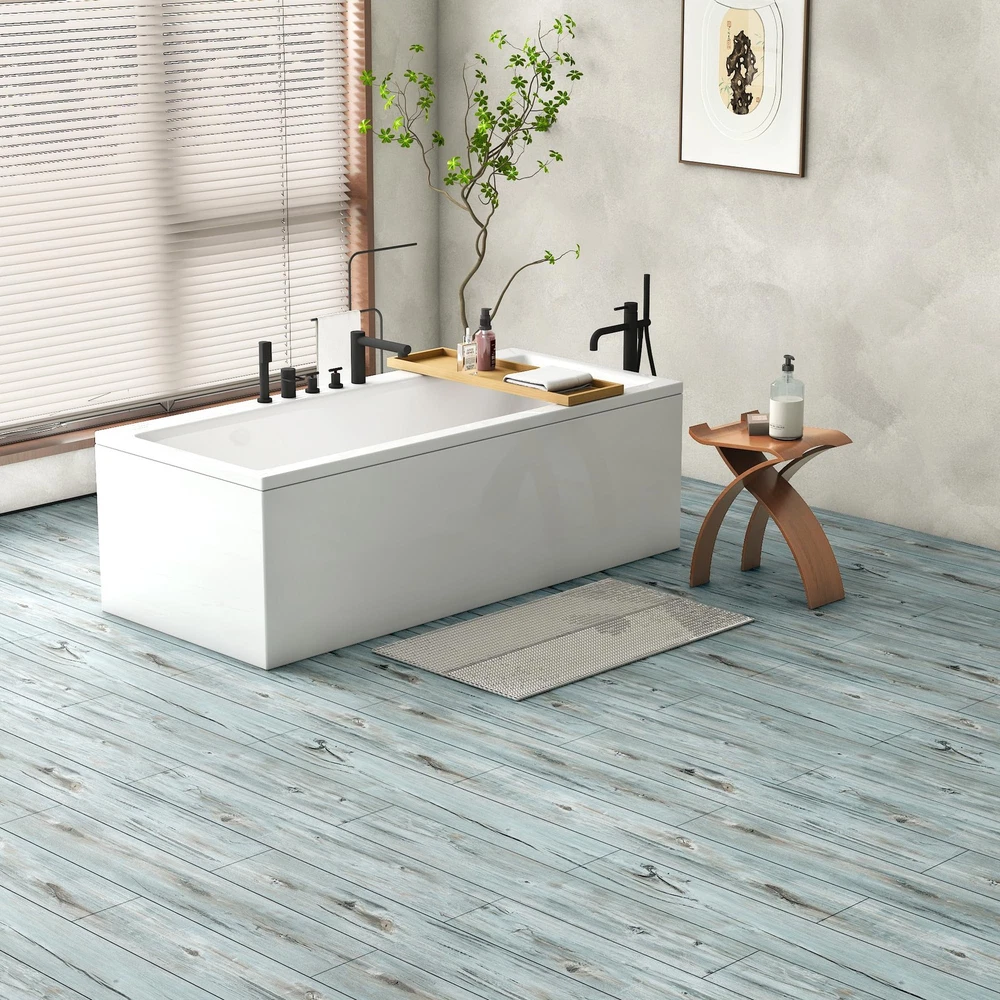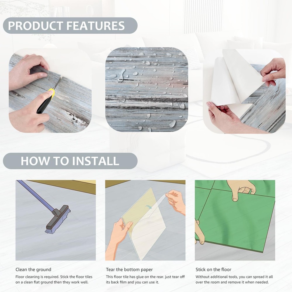 Product Specifications: Color and design:blue Size:36 inches long, 6 inches wide, and 1.5 millimeters thick Brand: Material:vinyl Purpose: Decorate old flooring Product Features: 1. Will not cause people to slip Wooden vinyl substrates have strong not slip properties and can be enhanced when exposed to water. Therefore, for families with elderly or children, using this self-adhesive flooring can effectively guard them. 2. Soft texture The texture is soft and elastic. For the foot feel of residents, it is relatively comfortable. The floor stickers contain a high elasticity foam layer, so using this material has strong impact resistance, which can effectively disperse the impact on the feet of consumers. After stepping on them, the feet feel comfortable, and there will be a feeling of warmth in winter and coolness in summer. 3. Simple paving Self adhesive flooring is very simple. The thickness of the floor sticker is only 0.6mm, and the weight per square meter is only 1 to 2 kilograms, which is less than 10% of the weight of ordinary floor materials. For example, in high-rise buildings, there are unparalleled advantages in terms of load-bearing capacity and space conservation. Just peel off the adhesive and put it down Kind Reminder: 1.When installing peel able floor tiles, please slowly peel off the original paper and do not peel off all at once 2.There is a slight odor due to the built-in adhesive. Don't worry, this is normal 3.To avoid color differences caused by different batches, it is recommended that you purchase a sufficient quantity of rolls at onc e to complete your decoration work High Quality Service: We are committed to building reliable brands and products, and your satisfaction is our greatest moti vation. If you encounter any problems during the purchasing process, please let us know and we will do our best to solve them for you. PACKAGE : Each package has 36pcs of vinyl floor tiles. each tile is 6''x36'', 0.62mm thick, one package can cover 54sq.ft in total. They are all made of different vinyl groups EASY TO INSTALL : Just peel and stick down on a flat floor installation, easy to cut, without complicated tool needed, do-it-yourself installation is economically and quickly. DIY friendly SUPERIOR PROPERTY : Self-adhesive vinyl floor waterproof and oil-proof, easy to clean with damp cloth or mop. wear resistant, scratch and abrasion resistant, flodable and removable, strong adhesion, the corners do not lift up WIDE APPLICATION:Great for cover worn and damaged floor in home, bedroom, kitchen, bathroom, rental housing, dorm, office,etc. Also suitable for use on walls, stairs and other DIY projects PEEL AND STICK VINYL PLANK FLOORING: Natural wood grain look texture, bring authentic wood look, add clean, natural, stylish character to your home. A budget friendly for renovation to give your room a new look