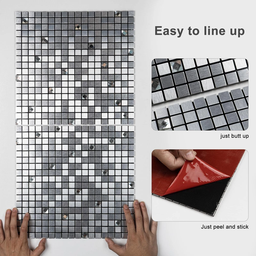 Peel and Stick Metal Backsplash, 8-Sheet Peel and Stick Glass Mixed Metal Tiles Stick on Backsplash for Kitchen Bathroom Wall Metal Backsplash Size: Come in a box of 8 sheets peel and stick metal backsplash tile, 11.8"L x 11.8"W x 0.2"H each, covering about 7.75 square feet Glass Mixed Metal Backsplash Tile: The design of metal and the glass will provide space with light and excellent visual quality, especially as a mirror edge Easy to Apply: Just peel and stick to install, no need to overlap, no grout and no mess, save your time and money on labor Waterproof and Heat Resistant: Lightweight, stiff and firm, resist to the heat, moisture and water in kitchen and bathroom, easy to maintain Multiple Usage: Widely used in kitchen backsplash, bathroom walls, shower, fireplace, and installed behind the stove