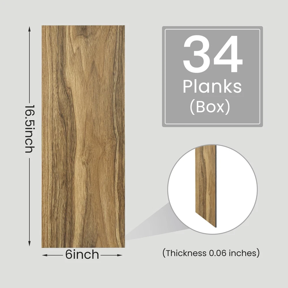 Why choose us? Powerful Feature - Strong self-adhesive and UV treatment make our PVC floor durable, good quality and longer service life. Also they are 100% waterproof, easy cleaning, stain & wear & scratch resistant, non-toxic and fire prevention. Easy DIY - Just peel and stick, on a flat floor or wall for installation, no tools, no experience, no glue. Everyone can do it. Dimention: Plank dimension: 6" width x 16.5" length x 0.07"thickness, pack of 34 pcs, covers 23.5 Sq.Ft. Made of high quality vinyl, durable, textured finish, low gloss, authentic wood look and feel. 100% Waterproof and Self-adhesive: peel and stick vinyl flooring planks use strong adhesive, which can hold the planks to flat ground firmly. Tiles are 100% waterproof with an IXPE integrated sound reduction underlayment that does not absorb water. Peel and Stick: Our vinyl flooring is easy to install, simply peel and stick the tiles to a flat and dry surface to give your home a brand-new look. Stylish: These vinyl floor tiles have the look and feel of natural wood grain. flooring tiles come in many natural wood-look colors so you’re sure to find the perfect match for any space. Application: Peel and stick floor tile for bathroom, bedroom, living room, kitchen, dining room, laundry room, basement, garage, RV floor, home decor, office, can be installed over most subfloor including concrete, vinyl laminate, plywood, ceramic tile