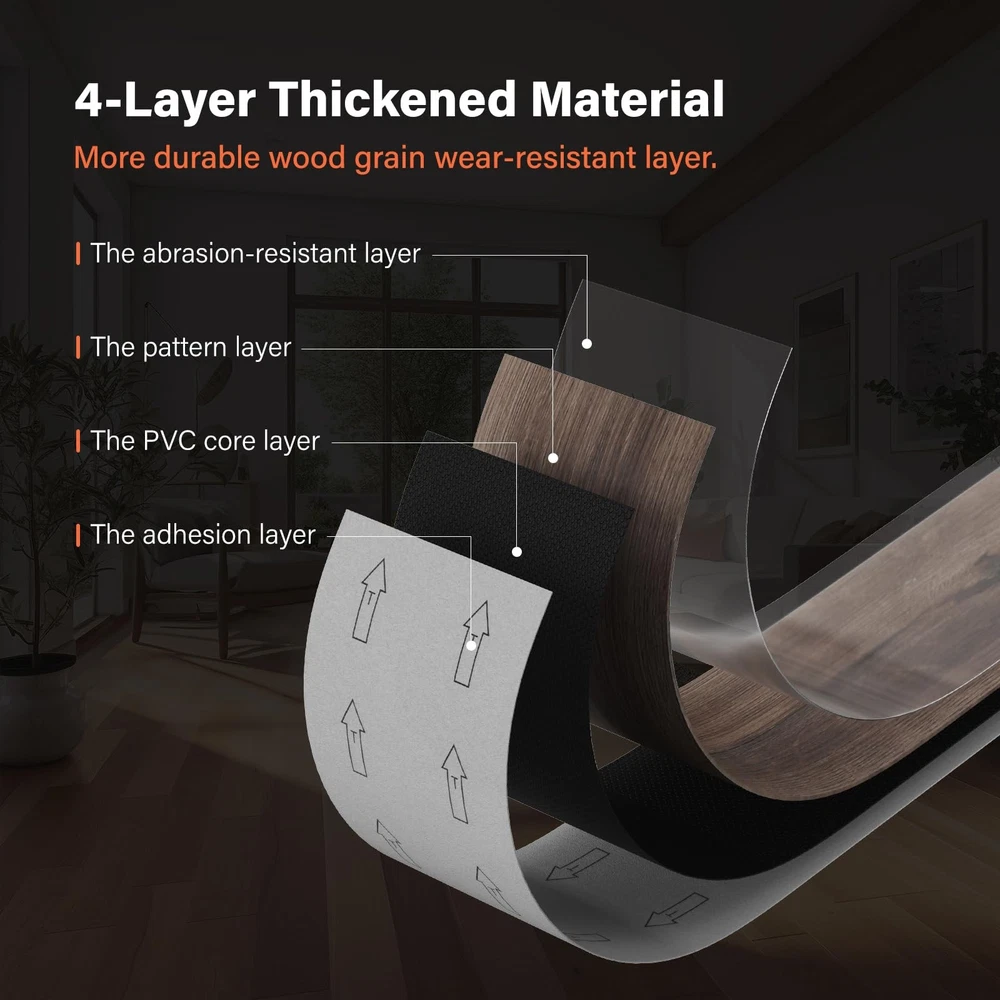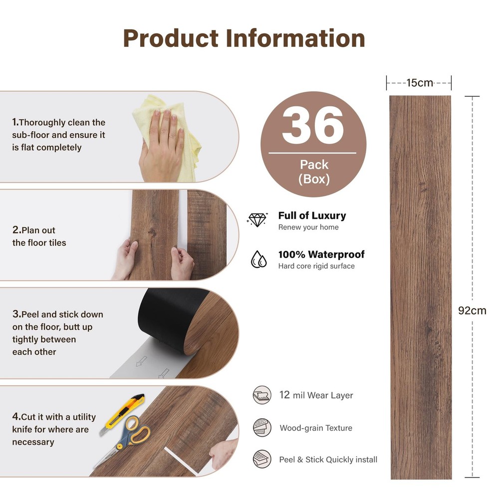 Peel and Stick Vinyl Flooring Tile, 36-Pack 54 Sq. Ft Self Adhesive Vinyl Plank Flooring Wood Grain Look Waterproof Floor Tile for Bedroom, Living Room, Kitchen, RV Made of Premium Quality Flexible PVC. Designed with natural wood decoration and is eye-catching--Adapt to different decoration styles. Thanks to the real wood grain look vinyl plank flooring, offering more durability and requiring less maintenance. Easy to install. Assemble quickly, thanks to its self-adhesive back. Installation of flooring tiles is straightforward. No cost to install. Everyone can do it. 【Sample of Peel and Stick Floor Tiles】 - We specially prepare 5 kinds of floor color samples for customers to buy, you can try to buy the sample to compare which color is more suitable and like, and you can see whether our material is good before buying the floor set! 【High Quality Material】 - Peel and stick vinyl plank flooring Tiles are crafted with the high quality vinyl, ensuring durability and longevity. Strong adhesign, with rigid core for stable and strong performance, stylish and classical surface designs keep good feeling. 【Easy to Install】 - Peel and stick down to practically any surface, make your home improvement easier and save your time & money. Great for Living Room wall Bathroom Kitchen RV Camper any room decoration. 【Perfect performance】 - peel and stick vinyl plank flooring Tiles boasting a rigid surface with a robust core and 100% waterproof. The wear, scratch, and abrasion-resistant properties ensure longevity, while the high strength guarantees no expansion and stability. 【The ideal Choice for Creating a Cozy Atmosphere in Your Room】 - waterproof vinyl plank flooring tiles not only add elegance to your space but also offer a warmer, more comfortable surface to walk on compared to traditional tiles.