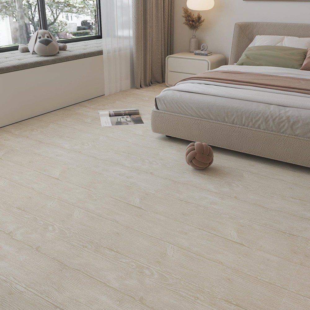 Specification Name: Wood Grain Vinyl Floor Sticker Material: PVC Color: beige Thickness: 0.3mm Pattern: wood grain pattern Size: 24x197 inches (WxL) Coverage area: 32.2 square feet/roll Features: self-adhesive, removable, waterproof, wear-resistant, easy to install, easy to clean Installation: just peel and stick Waterproof and Wear Resistant Vinyl Floor Covering: floor tiles are made using a multi-layer pressing process that is wear resistant, waterproof and easy to clean, simply clean as you would a normal floor. Peel and Stick Floor Tiles: Floor tiles floor rolls are easy to install, no special tools or adhesives needed, just peel off the backing and install on a flat and smooth surface. Large Vinyl Flooring Roll: The wood vinyl floor tile sticker measures 197 inches in length and 24 inches in width, each roll of floor sticker covers 32.2 square feet, which greatly improves installation efficiency by reducing the amount of material, seam requirements, and installation time when compared to traditional floor tiles and strips. Realistic Wood Pattern: The vinyl floor sticker has a realistic wood texture design, great for floor surfaces in bedrooms, living rooms, bedrooms, kitchens, lounges, RV's, offices, break rooms and more. About the Product: As this floor sticker is thin, the thickness is only 0.3mm, but we add a special wear-resistant layer to its surface, it can be used for a long time on flat and smooth surfaces, please consider its thickness factor before you buy it.