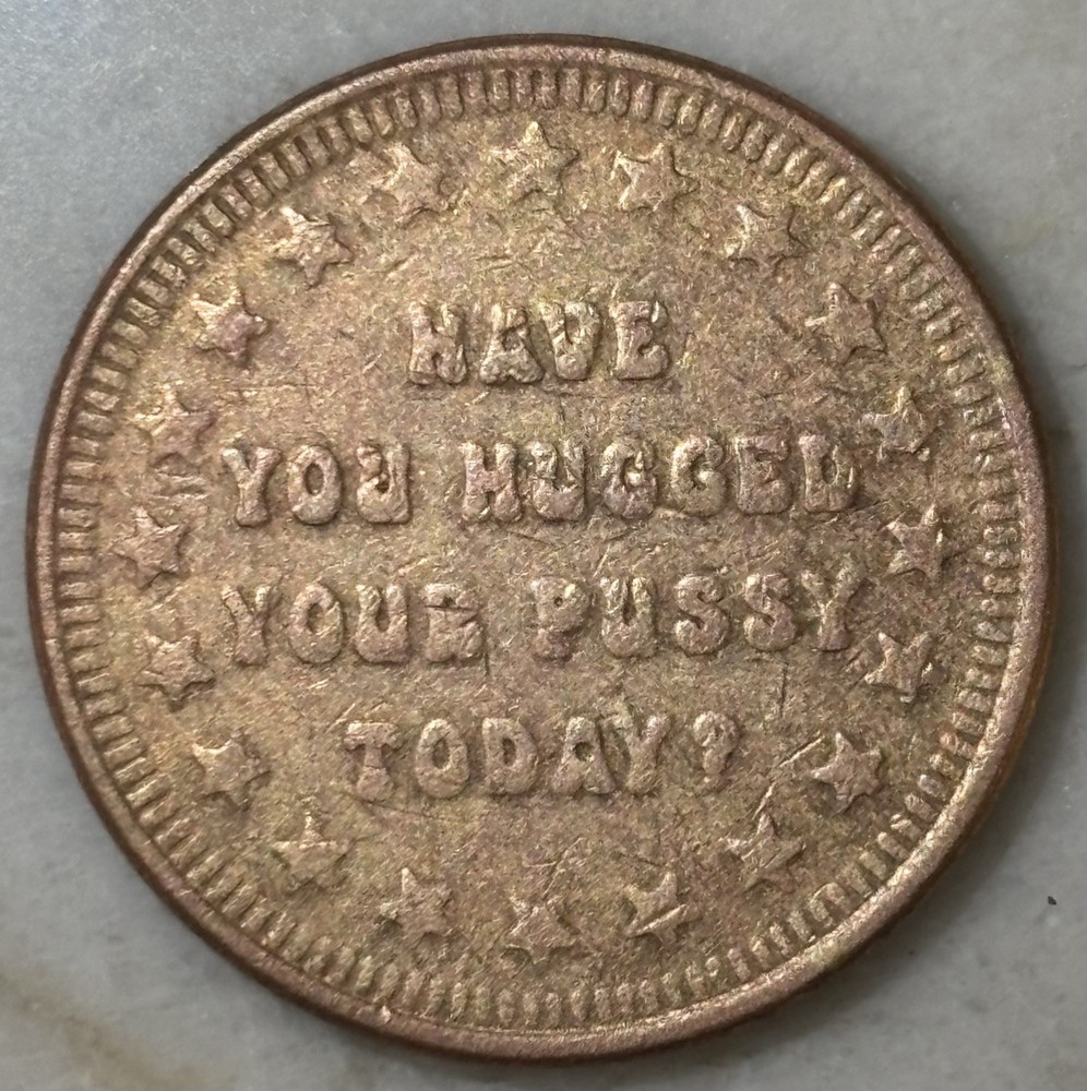 Vintage peep show token - message on one side and cat on the other. Disinfected ; )