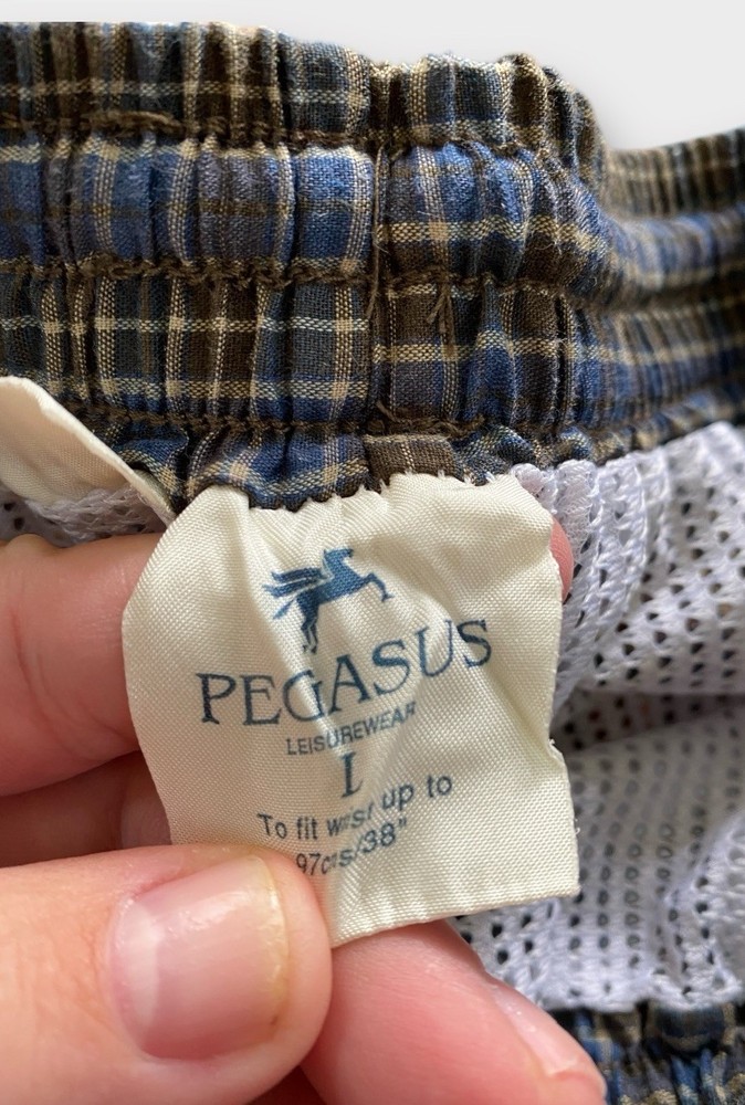 Type: Bottom Country of Origin: China Features: Above-the-Knee, Chlorine-Resistant, Comfortable Fit, Drawstring, Elastic Waist, Lightweight, Pockets, Quick Dry Size: L Brand: Pegasus Color: Blue Pattern: Plaid Swim Bottom Style: Trunks Vintage: No Garment Care: Machine Washable Size Type: Regular Department: Men Theme: Beach, Pool, Lake Life, Ocean, Vacation, Swimming
