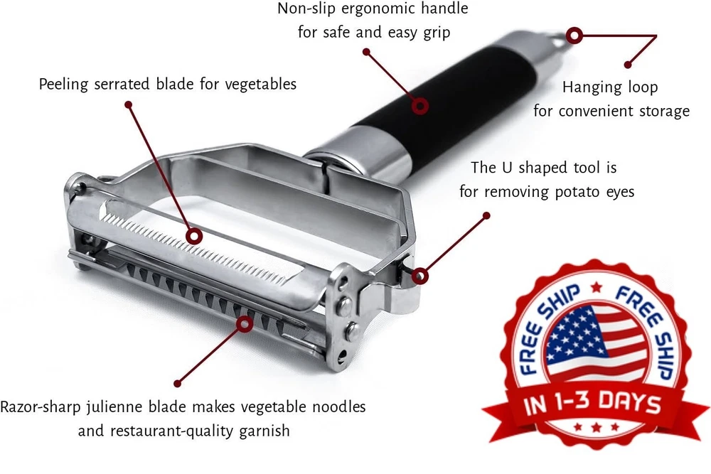 Pelador de verduras multifuncional Zanahoria Patata Fruta Slicer ✅ AFILADO EXTRAORDINARIO Y MULTIFUNCIONAL: pelador de cítricos, cortador en juliana, cuchillo y cortador de patatas es una herramienta todo en uno. Pelar, cortar y cortar en juliana nunca ha sido tan sencillo. Las cuchillas de acero inoxidable se deslizan fácilmente incluso a través de las verduras más duras. ¡Un dispositivo se puede utilizar como pelador de pepinos, cortador de pepinos, pelador de zanahorias e incluso pelador de cítricos! ✅ CÓMODO DE USAR Y FABRICADO PARA DURAR: los peladores de verduras para cocina están fabricados con acero inoxidable de alta calidad que no se oxidará y durará muchos años. El cómodo mango antideslizante del cortador de juliana proporciona un agarre firme incluso si sus manos están mojadas o aceitosas. El pelador y rebanador de manzanas con revestimiento suave alivia la presión de tu mano, por lo que no te cansarás mientras pelas. ✅ COMPACTO Y APTO PARA LAVAVAJILLAS: ahorre espacio en la cocina reemplazando el voluminoso pelador de verduras eléctrico y las herramientas y aparatos de cocina difíciles de limpiar por un solo pelador de frutas. Cabe fácilmente en cualquier cajón o se puede colgar usando el lazo del mango. Para lavar el pelador de limón simplemente pásalo bajo el chorro de agua. También es apto para lavavajillas. ✅ MEJORA TU COCINA CON INFINITAS OPORTUNIDADES DE PLATOS: sorprende a tus amigos con nuevas recetas similares a las de un restaurante y haz que tu cocina diaria sea entretenida. Decorar tus platos con guarniciones de aspecto delicioso, hacer fideos de calabacín, ensalada de papas, zanahorias ralladas, cortar verduras y frutas para ensaladas saludables, cortar papas fritas y queso, quitar la piel de la manzana o la naranja: es muy fácil con el pelador y cortador de zanahorias de cocina. Rallador de zanahorias