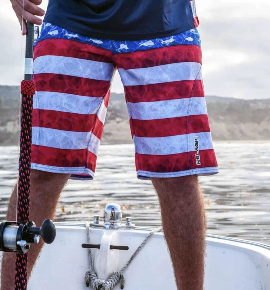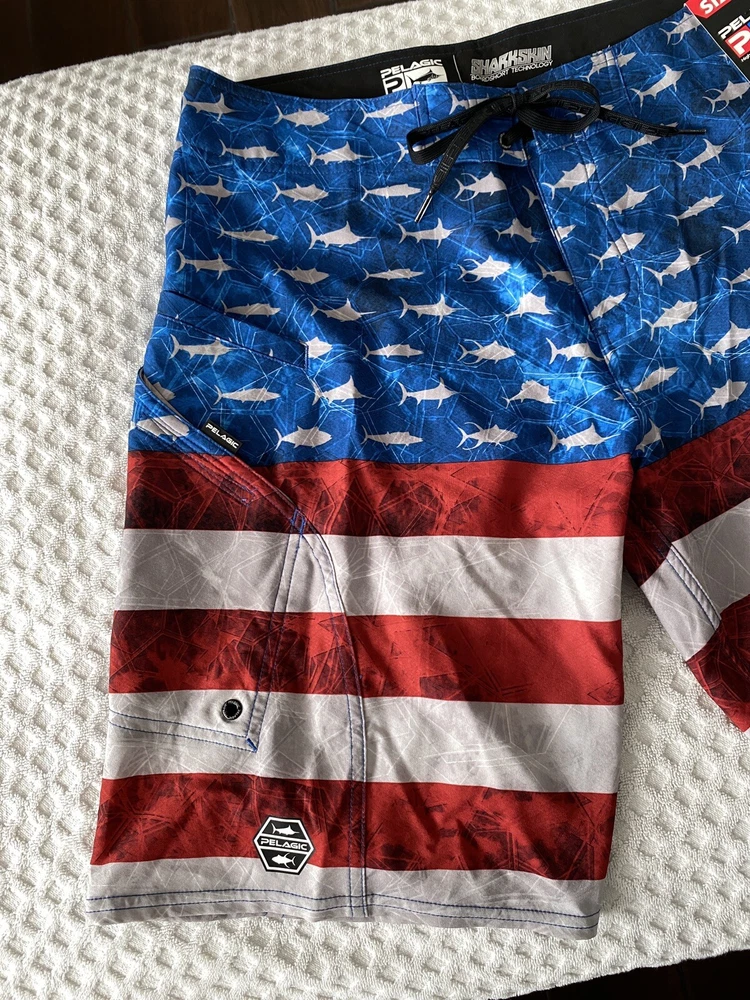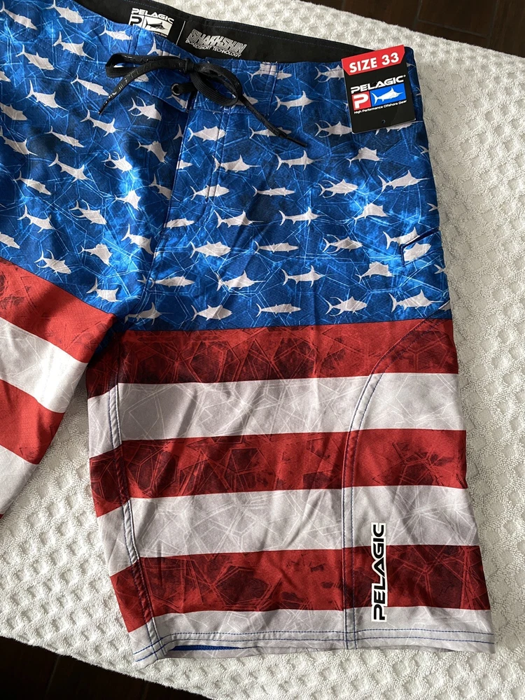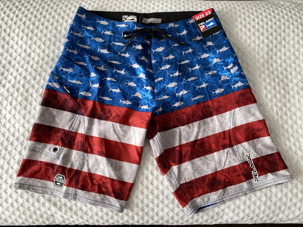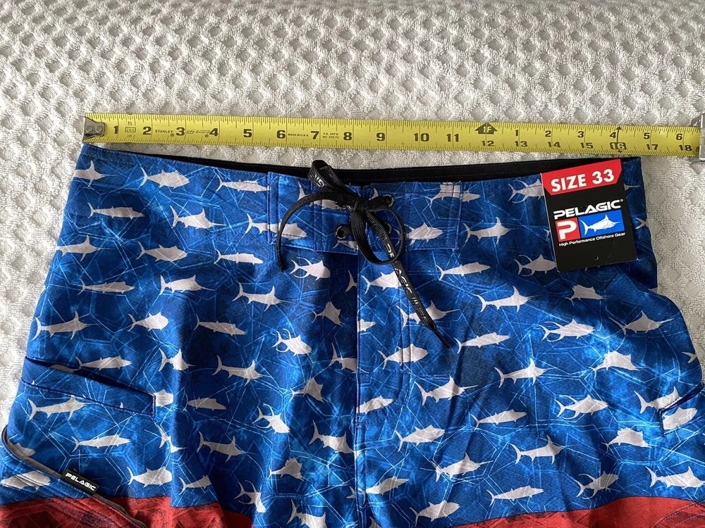 Up for sale is a brand new pair of men’s Pelagic Sharkskin Americamo Boardshorts in Red / White / Blue in a Size 33. Retail was $69. Style # 1001181010. The tag on the inside is mismarked and says “size 32”, but the waist measures 16.5” across (size 33). Details below. Please see pictures for a better understanding and ask any questions prior to purchasing as we do not accept returns. Thank you! DETAILS Pelagic Sharkskin Boardshort Technology features a 4-way super-stretch, Sharkskin-dobby fabric, and stain release and hydro-repel technology to bring versatility and comfort for all ocean sport activities. Boasting 4 all-purpose storage pockets, these shorts are a combination of performance and utility featuring a side hook and loop fastener pocket, back zipper pocket, and reinforced plier and cell phone pockets. The SHARKSKIN series is the ultimate choice for performance in all types of ocean conditions. 92% polyester; 8% spandex. Imported. Best Use Fishing, Kayaking, Paddle Boarding Care Machine Wash Department Men's Fit Regular/Relaxed Inseam 11" Length Mid-Length Material 92% Polyester/8% Spandex Outseam 21" Pattern Americana Style Boardshort Technologies Stain Repellent Water Resistance Water Repellent Bin A1