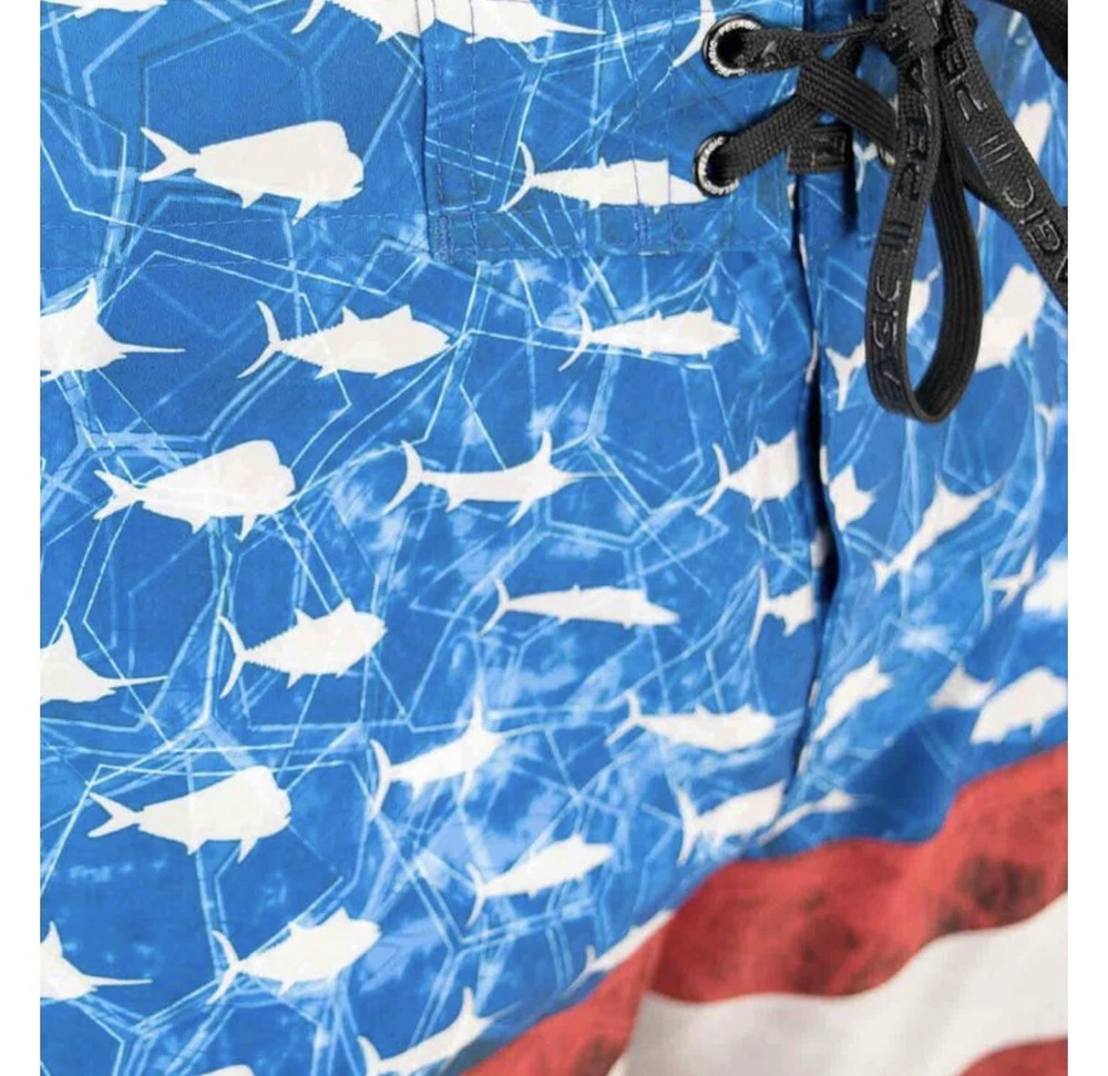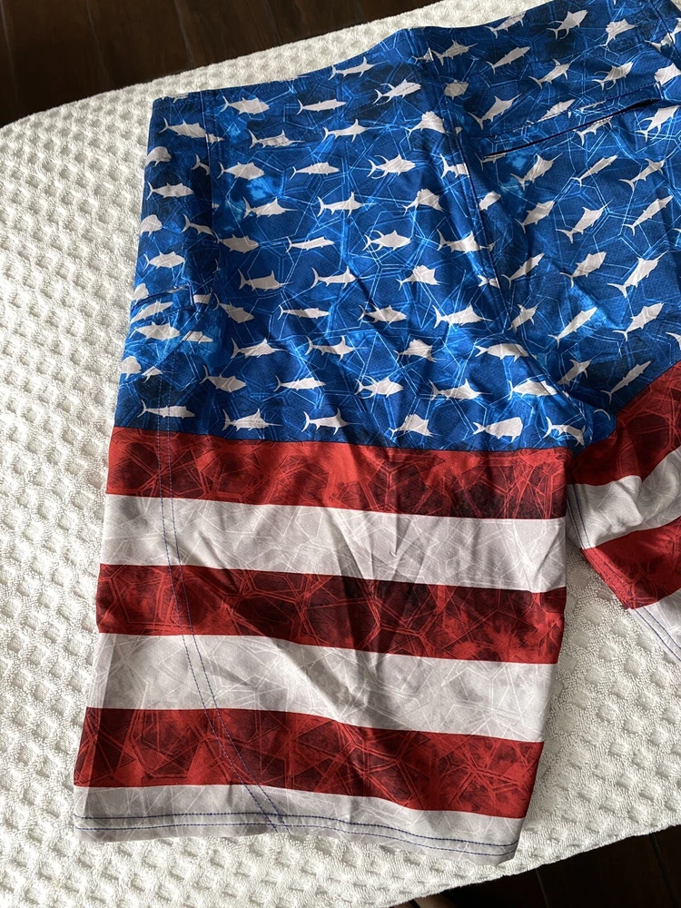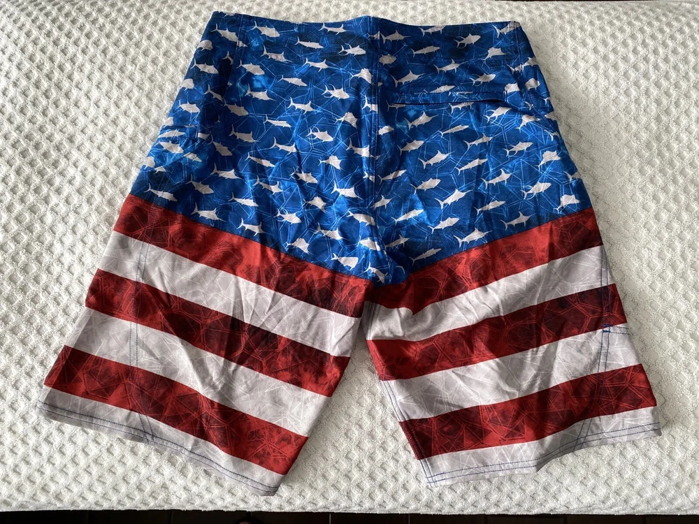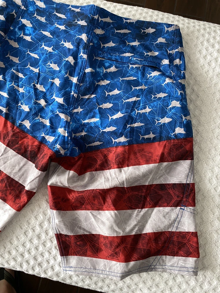 Up for sale is a brand new pair of men’s Pelagic Sharkskin Americamo Boardshorts in Red / White / Blue in a Size 33. Retail was $69. Style # 1001181010. The tag on the inside is mismarked and says “size 32”, but the waist measures 16.5” across (size 33). Details below. Please see pictures for a better understanding and ask any questions prior to purchasing as we do not accept returns. Thank you! DETAILS Pelagic Sharkskin Boardshort Technology features a 4-way super-stretch, Sharkskin-dobby fabric, and stain release and hydro-repel technology to bring versatility and comfort for all ocean sport activities. Boasting 4 all-purpose storage pockets, these shorts are a combination of performance and utility featuring a side hook and loop fastener pocket, back zipper pocket, and reinforced plier and cell phone pockets. The SHARKSKIN series is the ultimate choice for performance in all types of ocean conditions. 92% polyester; 8% spandex. Imported. Best Use Fishing, Kayaking, Paddle Boarding Care Machine Wash Department Men's Fit Regular/Relaxed Inseam 11" Length Mid-Length Material 92% Polyester/8% Spandex Outseam 21" Pattern Americana Style Boardshort Technologies Stain Repellent Water Resistance Water Repellent Bin A1