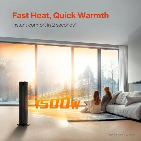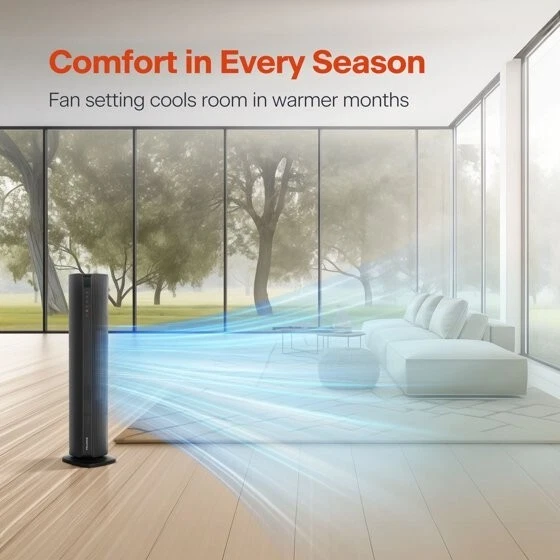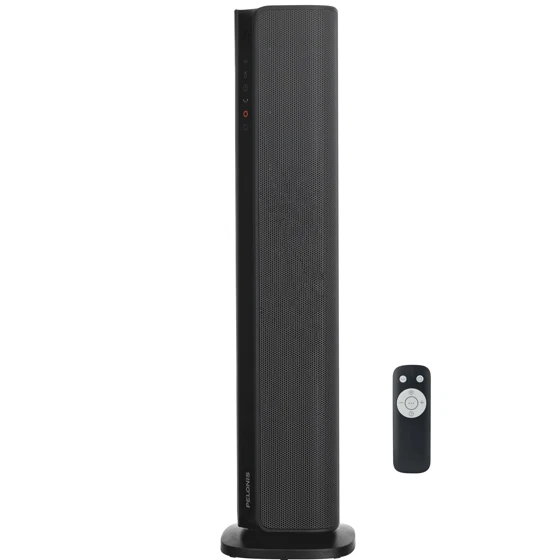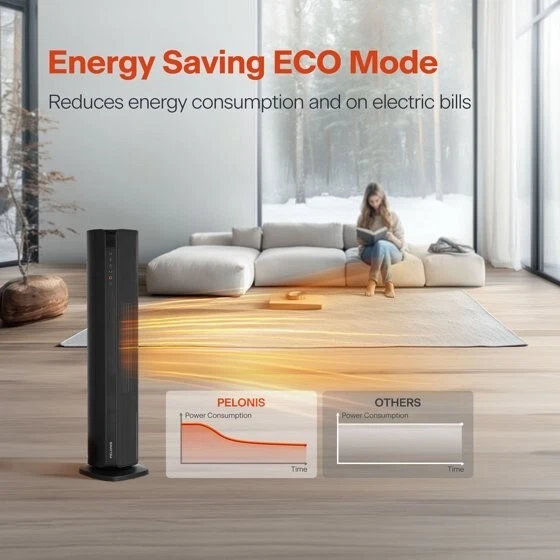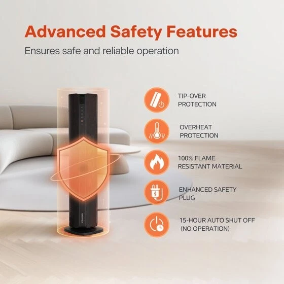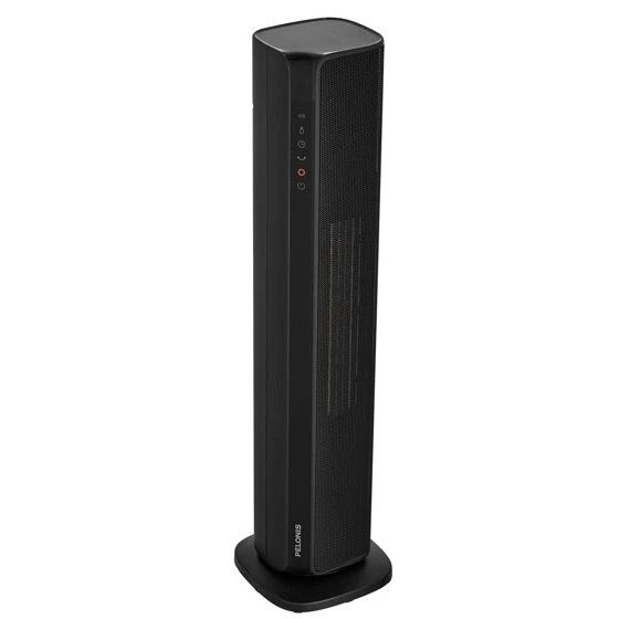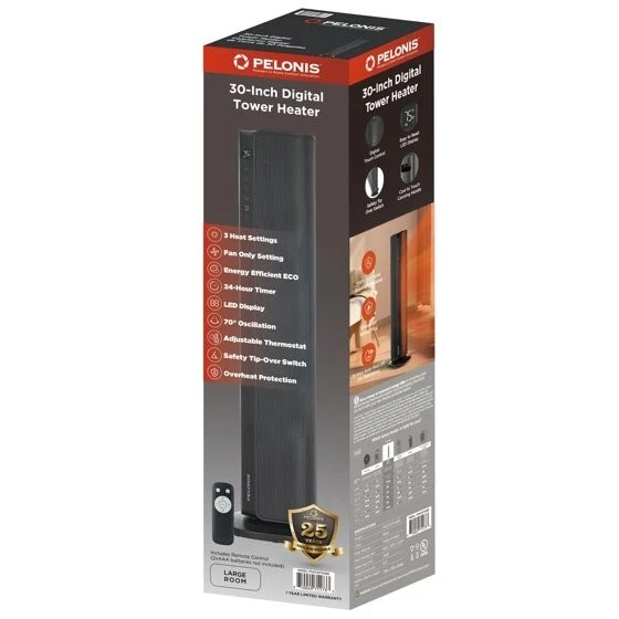 Product details The new Pelonis 30-Inch Tower Heater, PSHC30TD4BB offers 3 heat settings, a fan only setting, and an energy-efficient ECO mode to keep you comfortable in any season. With a remote control, easy to read digital LED display, 24-hr timer and adjustable thermostat, customizing your environment is effortless. Enjoy 70°of oscillation for even heat distribution. Safety features include a tip-over switch, overheat protection, 15-hr auto shut-off, an enhanced safety plug, and made of 100% VO flame resistant material. Experience comforting warmth with peace of mind. Choose from high, medium, or low heat settings for flexible comfort Easy to read display and remote control from a distance Set and maintain your ideal temperature for personalized comfort Shuts off instantly if tipped for enhanced safety Automatically shuts off to prevent overheating hazard Automatically shuts off after 15 hours to prevent overheating Saves energy by adjusting heat output to maintain desired temperature Schedule on/off times for convenient, energy-saving use Distributes heat evenly across a wide area for consistent comfort Constructed from materials that resist flames for added safety