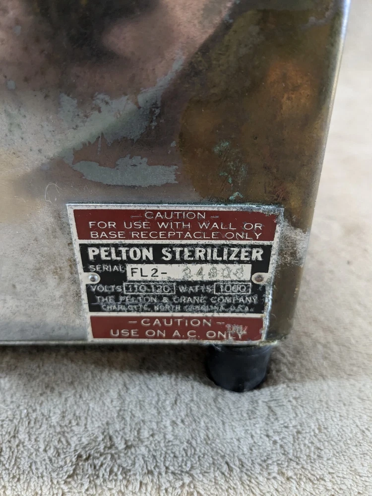 Type:SterilizerColor:SilverBrand:The Pelton & Crane CoStyle:Art DecoMPN:Does Not ApplySeller Notes:“Untested but it will need a new power cord. See pictures.”Model:Pelton & Crane Co FL2Materials:Metal