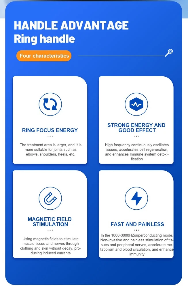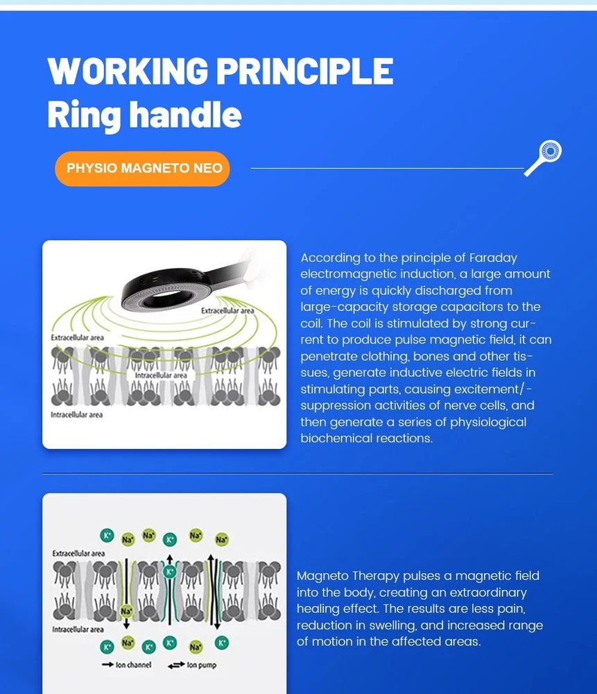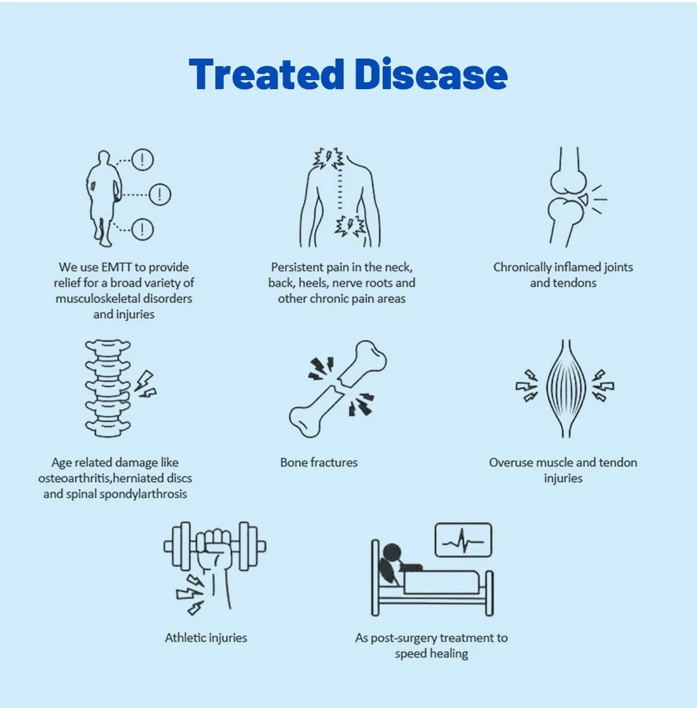EMSZERO HI-EMT Magnetic Therapy Device - Professional Body Shaping & Pain Relief Advanced HI-EMT Magnetic Therapy Device Non-Invasive Body Shaping, Muscle Toning & Pain Relief - Professional Grade for Home & Clinic Use Buy Now Key Features & Advantages Advanced HI-EMT Technology High-energy focused electromagnetic waves induce powerful muscle contractions, promoting muscle growth and fat breakdown. Strong Energy & Focused Stimulation 6T stimulus strength, 8cm penetration depth, U-shaped coil for targeted treatment on joints, muscles and pain areas. Painless & Non-Invasive Non-surgical, no downtime - stimulates tissues through clothing without skin contact, zero side effects. Smart Touch Control 1.3-inch adjustable brightness display, 8 language options, easy navigation for energy, time and user settings. Full Body Applicability Suitable for abdomen, buttocks, arms, legs, neck, back - ideal for shaping and pain relief. Safe & Low Maintenance Intelligent air cooling system, no liquid leakage risk, easy cleaning and 1-year warranty. Working Principle Based on Faraday's electromagnetic induction principle, the device discharges high energy from large-capacity capacitors to the coil. The coil generates pulsed magnetic fields that penetrate clothing, bones and tissues, creating inductive electric fields in target areas. This stimulates nerve cells and muscle tissue, triggering physiological reactions such as: Powerful muscle contractions for shaping and toning Accelerated fat metabolism (fatty acid release from triglycerides) Improved blood circulation and lymphatic detoxification Pain relief and reduced inflammation for musculoskeletal disorders Indications & Applications Body Shaping & Muscle Toning Improve abdominal tone and strengthen abdominal muscles Tone and firm buttocks, thighs and calves Enhance muscle firmness in arms Healthy weight loss辅助 through fat breakdown Pain Relief & Rehabilitation Chronic pain (neck, back, heels, nerve roots) Inflamed joints and tendons Osteoarthritis and spinal spondylarthrosis Sports injuries and post-surgery recovery Bone fracture healing support How to Use Device Installation: Install the ring bracket, attach the EMS ring, connect the power cord to the device and socket. Pre-Treatment Preparation: Remove metal jewelry, avoid eating 1 hour before use, wear appropriate clothing. Parameter Setting: Turn on the device, select user gender, age group and treatment area. Adjust energy (0-1500W) and time (up to 60 mins) via touch screen. Start Treatment: Align the magnetic ring with the target area, press start. Monitor progress via real-time display. Post-Treatment: Press and hold power button to shut down. Clean the ring with 75% alcohol. Important Safety Warnings & Contraindications Do NOT use this device if you are/will have: Skin wounds (avoid treatment area if wounded) Heart disease (especially with pacemaker), cancer or infectious diseases Pregnancy, lactation or menstrual period Recent major surgery, diabetes or cerebrovascular disease (stroke patients) Metal implants or substances in the body Additional Precautions: Do not use on a full stomach, avoid eating/drinking during treatment, do not disassemble the device by yourself. Technical Specifications Parameter Details Input Power Supply AC110V-220V 50/60Hz Maximum Output Power 0-1500W Frequency Range 5-200Hz (adjustable) Screen Size 1.3 inches (touch-controlled, brightness adjustable) Device Color Black & White Net Weight 10.55kg Penetration Depth Up to 8cm Language Options English, Chinese, Korean, Japanese, Russian, French, Portuguese, Spanish