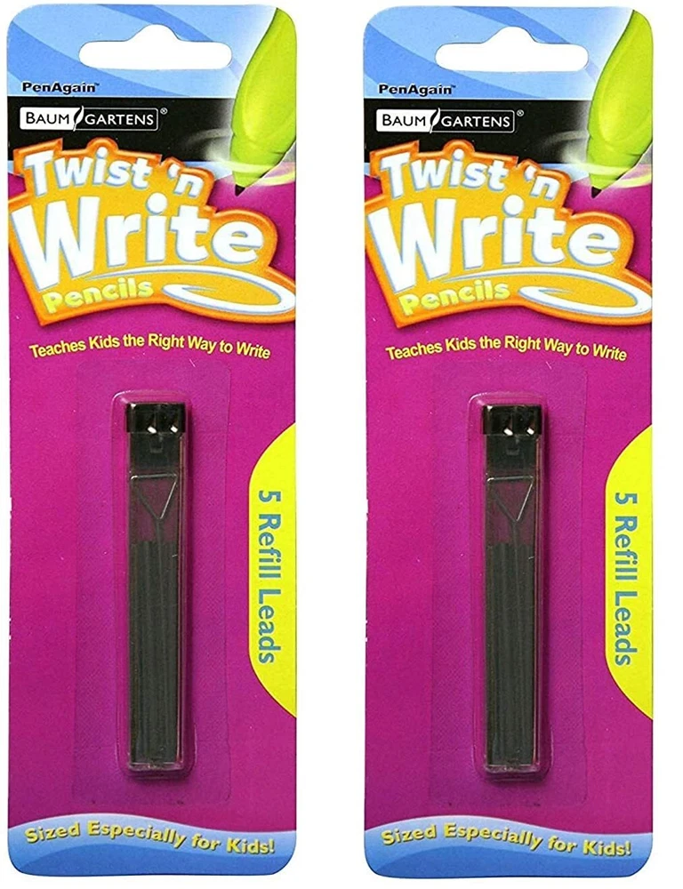 PenAgain Twist 'N Write Pencil Kids Learning Writing Assorted Colors 4 Count with 10 lead refills. Twist-n-Write Pencil is specially designed to fit smaller hands and make writing easier. The thick 2mm pencil lead never needs sharpening. Just twist the tip to expose more lead. Kids get excited about the Twist-n-Write because it puts the fun back into writing. The pen's wishbone shaped body naturally shapes the fingers into the school-taught "tripod" finger grasp. Whether your kids are doodling or practicing longhand, the soft rubber body and curvy shape are built for comfort. What Harry Potter books did to get kids reading again, Twist-n-Write will do to get them back to the joy of writing and help them focus on their content without worrying about their pencil grip or their writing speed. The Twist-n-Write 4-pack has pencils in green, pink, purple and blue. Set includes 4 Twist n Write Mechanical Pencils with additional 10 lead 2mm black lead refills. Unique wishbone shape develops and supports tripod grip Bright colors, 1 each of yellow, dark blue, magenta pink, purple and black refills Designed to fit small hands. Helps children learn to write with proper grip Refillable 2mm nontoxic lead. Erasers on each side of wishbone.