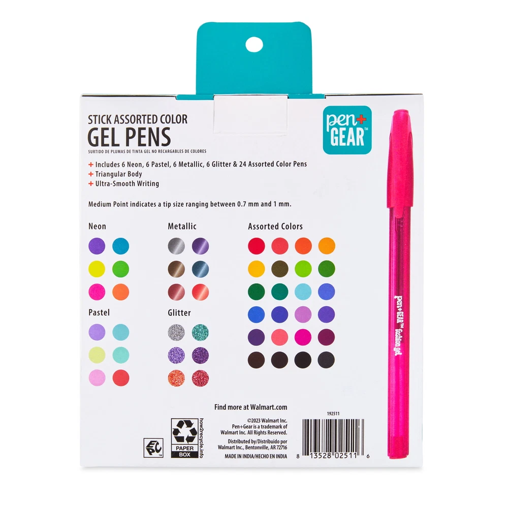 The caps have a pocket clip for easy storage and access, so you can clip them to binders, papers, and more. Create artistic masterpieces with gel stick pens. This set includes 6 pastels, 6 neons, 6 glitters, 6 metallics, and 24 trendy quick-drying ink colors, perfect for doodling, writing, coloring, labeling, and more. The bright colors add a of color to any project or craft. They are medium nibs, perfect for writing on dark paper, where the ink will stand out. These pens have round barrels, so you can write with them comfortably. Check out the collection for more school and office essentials like folders, pencils, markers, highlighters, sticky notes, planners, journals, and more. The possibilities are endless with gel stick pens. Gel Stick Pens, Medium Nib, 0.7mm, Assorted Colors, 48 Count Perfect for writing on dark paper, where the ink will stand out