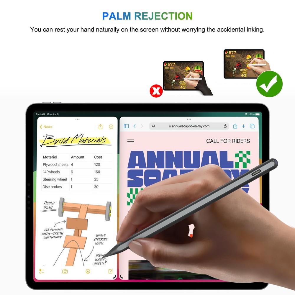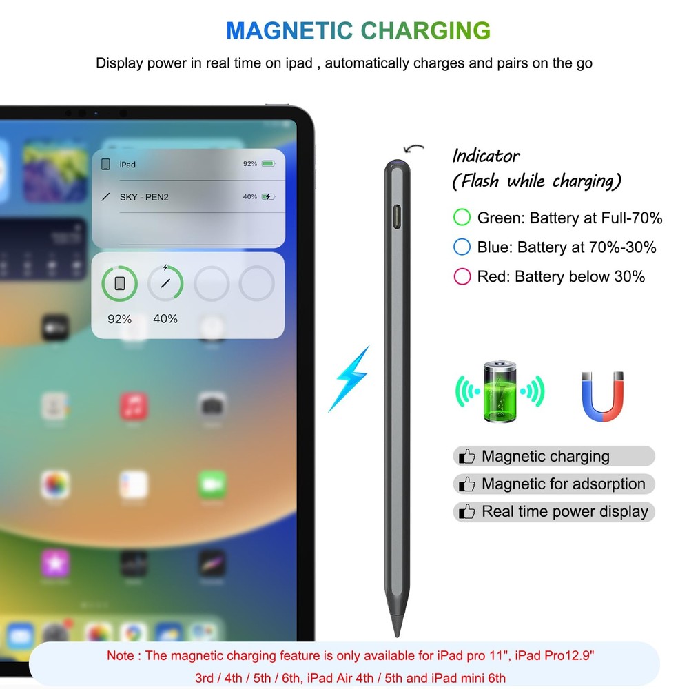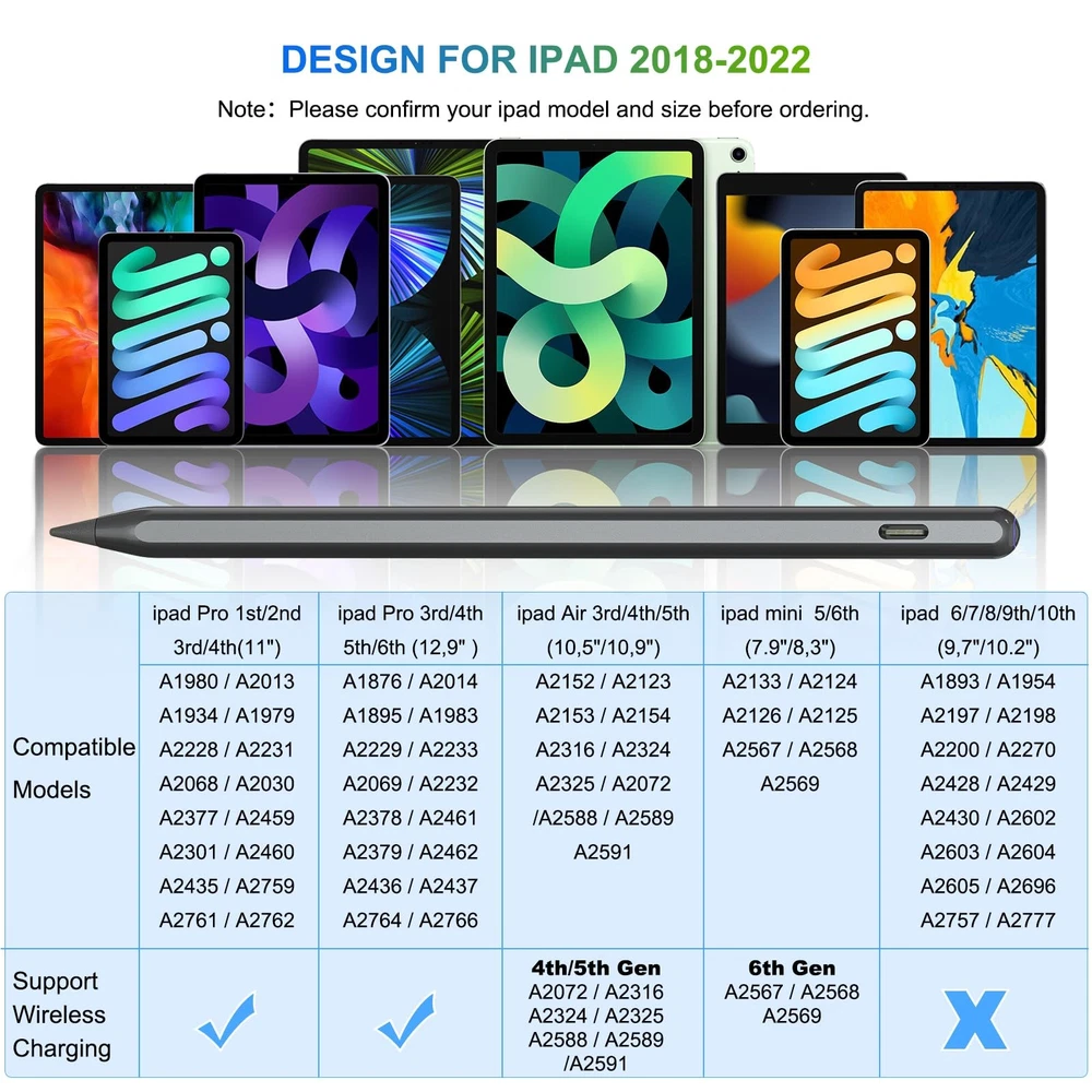 Pencil 2nd Generation Wireless Charging, Pencil for iPad with Tilt & Palm Rejection, Magnetic Stylus Pen Compatible with ipad Air 3/4/5, ipad Mini 5/6, ipad 6/7/8/9/10, ipad Pro 11/12.9 (Black) MAGNETIC WIRELESS CHARGING + TYPE C QUICK CHARGING - The upgrade of the pencil 2nd generation breaks through the new technology of wireless charging, which allows you to charge the pen for ipad by attaching it to your ipad. plus, we've added a USB-C quick charging port, USB-C charging in 30 minutes and the magnetic charging is fully charged in 1.5 hours allows 10 hours of continuous use and an intelligent shut-off after 5 minutes of inactivity. DESIGN FOR IPAD 2018-2025 - This pencil for ipad is compatible with ipad 6/7/8/9/10/11 generation, ipad Air (M3/3/4/5 generation), ipad Mini (5/6 generation), ipad pro 11"/12.9", this is definitely the best alternative to the pencil 2nd generation. Note: magnetic charging is only for ipad Air 4/5, ipad Mini 6, ipad pro 11/12.9 inch available. If you do not know how to confirm the ipad model number, please contact us. PALM REJECTION -- This pen for ipad 9 generation supports palm rejection, tilt and replace tips. No Bluetooth or app connection is required. Simply click the button above and make a Bluetooth connection to your ipad to write, draw, mark, sign and note with this ipad pen right on your ipad. But please note: this pencil has no pressure sensitivity. BATTERY LEVEL INDICATOR -- After our pencil for ipad 10 generation is connected to the ipad via Bluetooth, you can read the battery level in the status bar. There is also a power indicator for the ipad pen, which shows the battery level of the stylus pen for ipad: blue (working status), red (charging status) and green (fully charged). PACKAGE INCLUDES -- 1 x pencil 2nd genaration, 3 x repalceable tips, 1 x charging cable type C, 1 x user manual. We offer 24/7 online support and a 1 year warranty from date of purchase. If you have any questions about our pencil, we will make sure you receive a refund or a replacement.