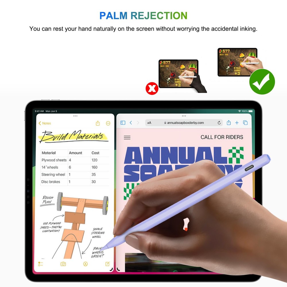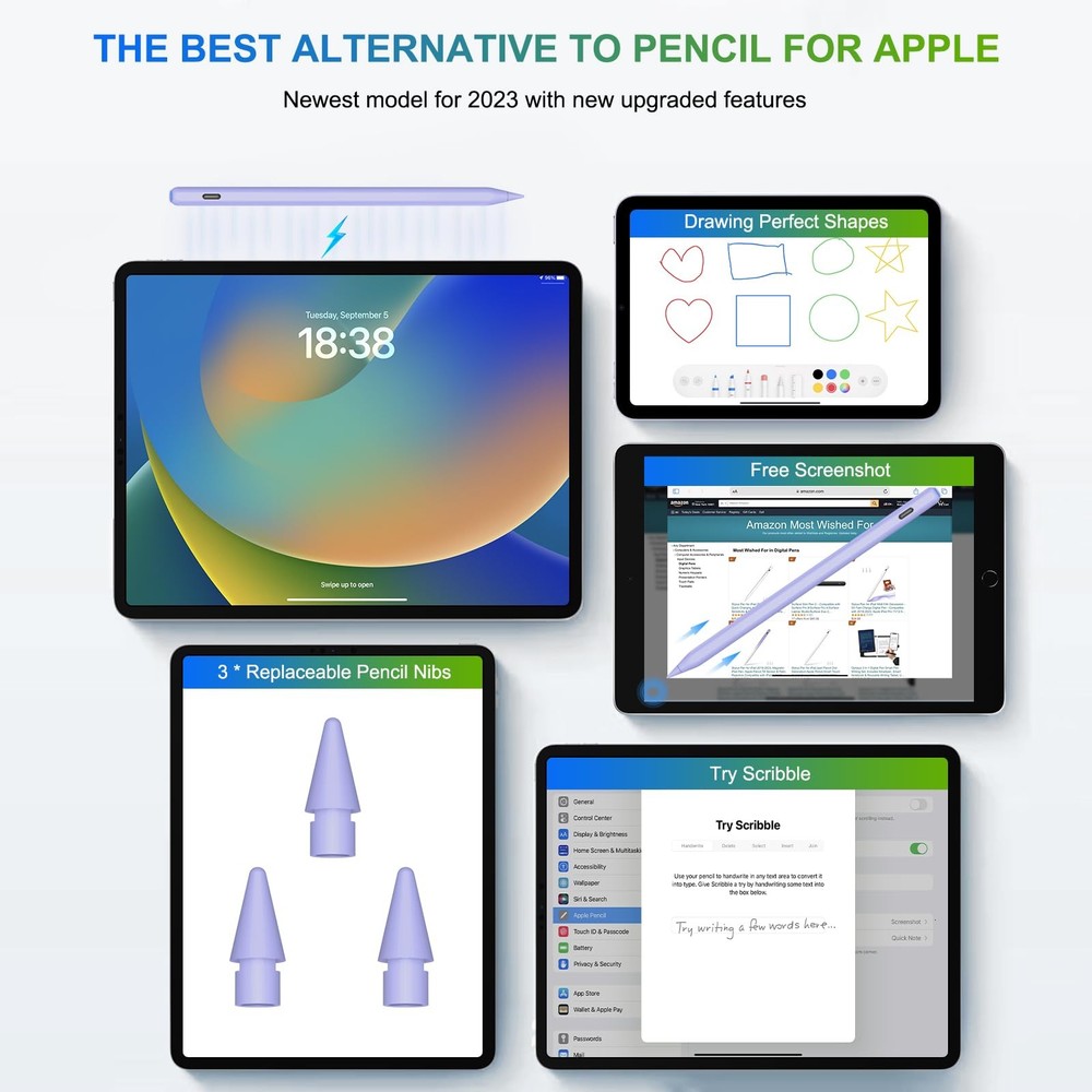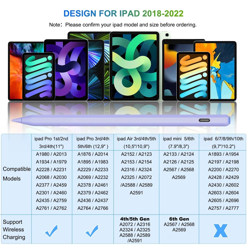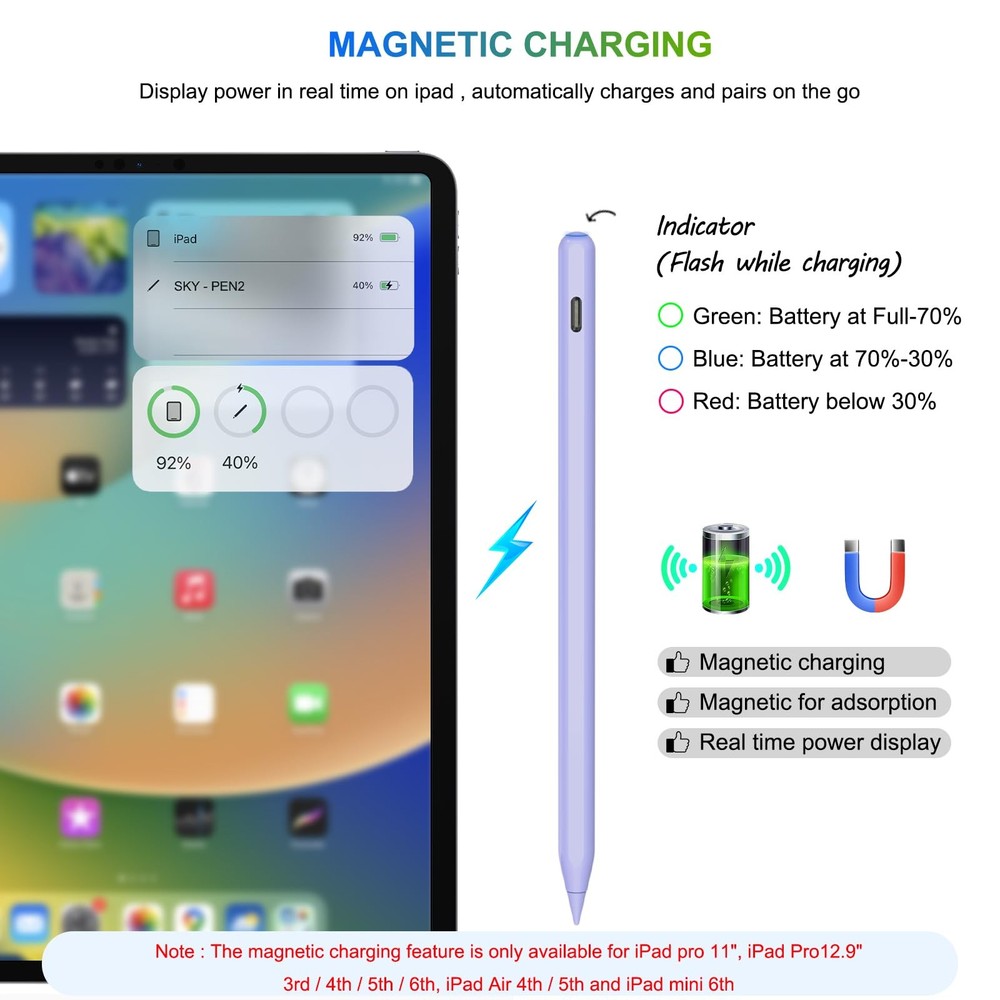 Pencil 2nd Generation Wireless Charging, Pencil for iPad with Tilt & Palm Rejection, Magnetic Stylus Pen Compatible with ipad Air 3/4/5, ipad Mini 5/6, ipad 6/7/8/9/10, ipad Pro 11/12.9(Purple) MAGNETIC WIRELESS CHARGING + TYPE C QUICK CHARGING -- The upgrade of the pencil 2nd generation breaks through the new technology of wireless charging, which allows you to charge the pen for ipad by attaching it to your ipad. plus, we've added a USB-C quick charging port, USB-C charging in 30 minutes and the magnetic charging is fully charged in 1.5 hours allows 10 hours of continuous use and an intelligent shut-off after 5 minutes of inactivity. DESIGN FOR IPAD 2018-2025 - This pencil for ipad is compatible with ipad 6/7/8/9/10/11 generation, ipad Air (M3/3/4/5 generation), ipad Mini (5/6 generation), ipad pro 11"/12.9", this is definitely the best alternative to the pencil 2nd generation. Note: magnetic charging is only for ipad Air 4/5, ipad Mini 6, ipad pro 11/12.9 inch available. If you do not know how to confirm the ipad model number, please contact us. PALM REJECTION -- This pen for ipad 9 generation supports palm rejection, tilt and replace tips. No Bluetooth or app connection is required. Simply click the button above and make a Bluetooth connection to your ipad to write, draw, mark, sign and note with this ipad pen right on your ipad. But please note: this pencil has no pressure sensitivity. BATTERY LEVEL INDICATOR -- After our pencil for ipad 10 generation is connected to the ipad via Bluetooth, you can read the battery level in the status bar. There is also a power indicator for the ipad pen, which shows the battery level of the stylus pen for ipad: blue (working status), red (charging status) and green (fully charged). PACKAGE INCLUDES -- 1 x pencil 2nd genaration, 3 x repalceable tips, 1 x charging cable type C, 1 x user manual. We offer 24/7 online support and a 1 year warranty from date of purchase. If you have any questions about our pencil, we will make sure you receive a refund or a replacement.