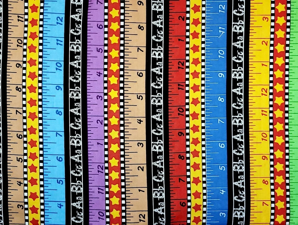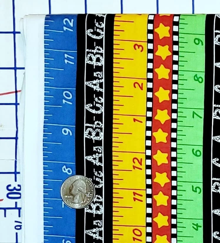 Welcome to Janey Lane Fabrics! Up for your consideration: A fabric by Kimberly Montgomery for MBT. This fabric has a ruler and chalkboard stripe in a multicolor stripe design. The stripes run lengthwise; parallel to the selvage. Condition: Laundered, pressed Fiber Content: 100% Width: Up to 45" Photos are taken with selvage edges of fabric to the left and right sides of the photo. Available for custom cuts for 1/2 yard or more? YES, please request a custom listing. Most requests will be considered. This fabric is being sold BY THE YARD (BTY). Purchases of more than ONE YARD will ship as a continuous length . Fabric orders less than 2 yards will be shipped first class via USPS. 2-5 yards $7.95 Priority Mail Flat rate envelope 6-20 yards $13.60 Priority Mail Medium Flat rate box To receive a shipping discount for two or more yards, add the items to your cart, then "request total from seller." You will be sent an invoice with the combined shipping cost. Smoke free / pet free home. Keep checking back as I will be listing more fabrics, notions, patterns, and trims. If you are looking for something you don't see here, let me know. I have a lot more inventory to list! Due to differences in computer monitors / screen resolution, actual colors may vary slightly from those shown. Please contact me for any questions before buying. Thank You!