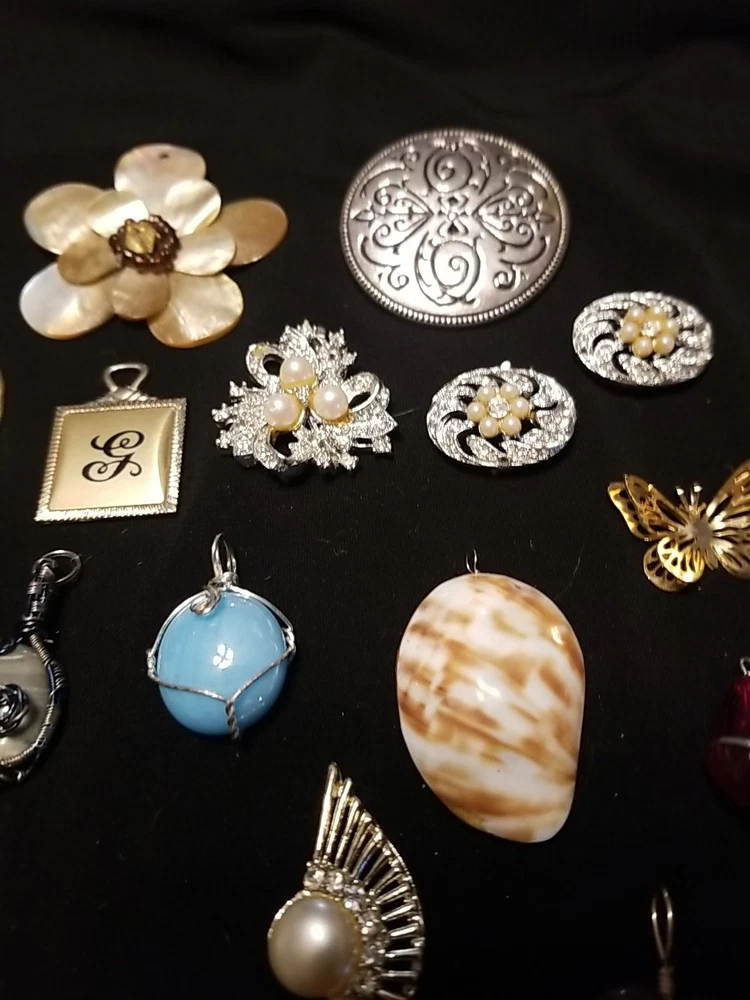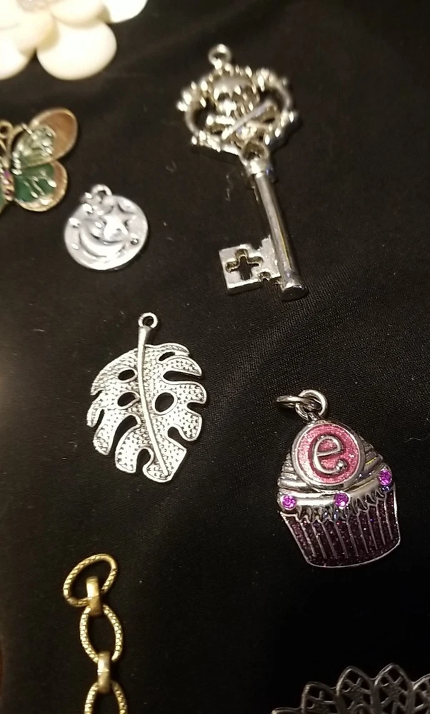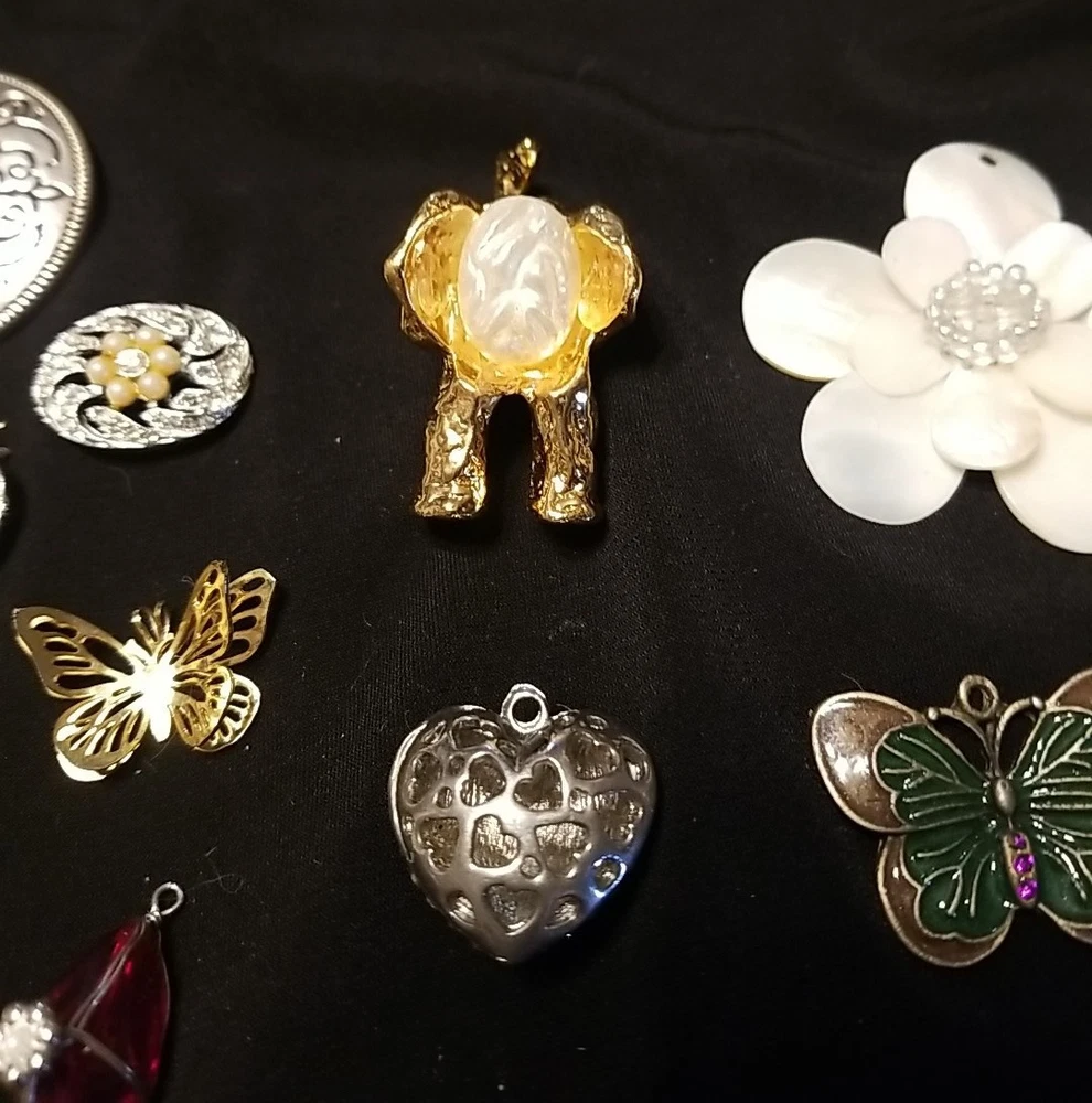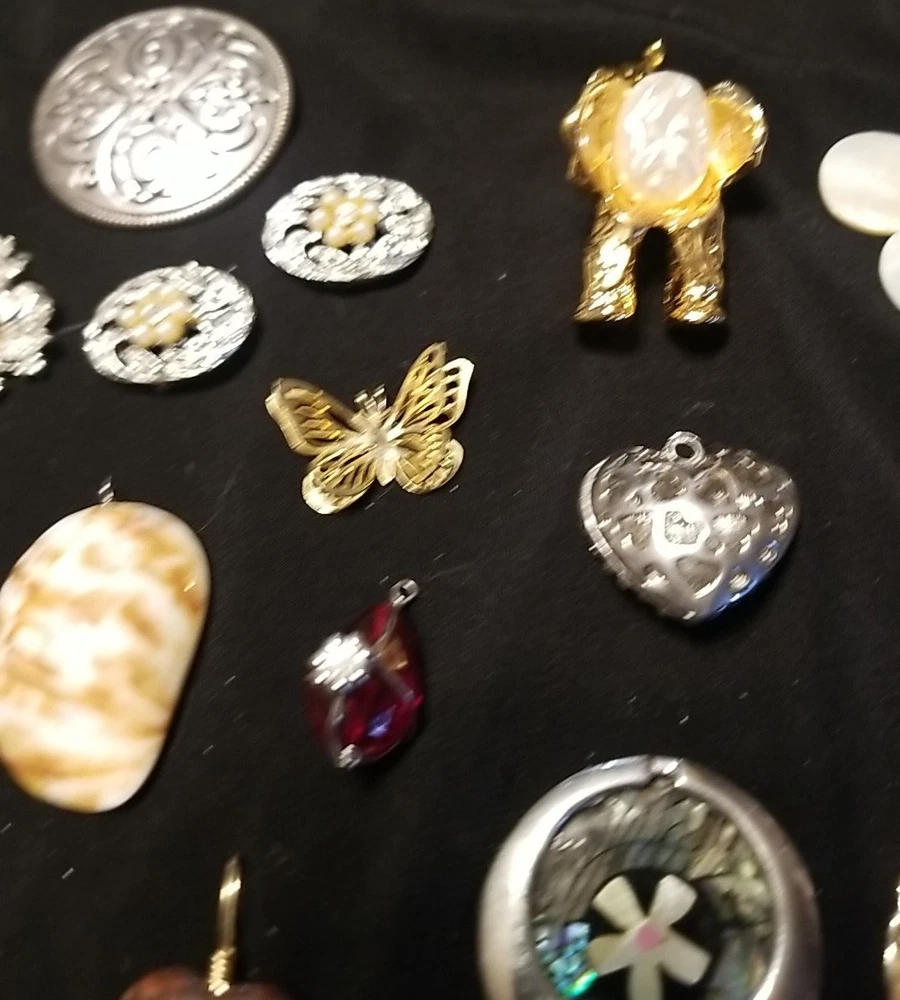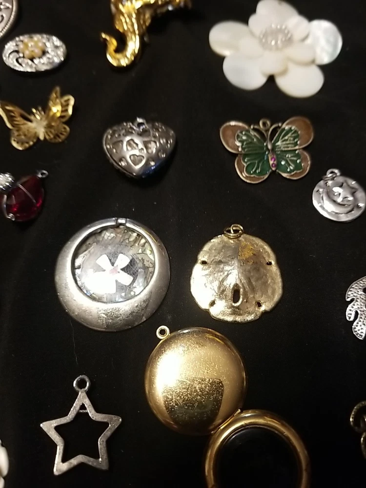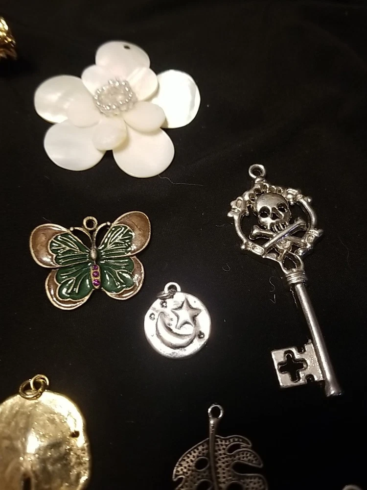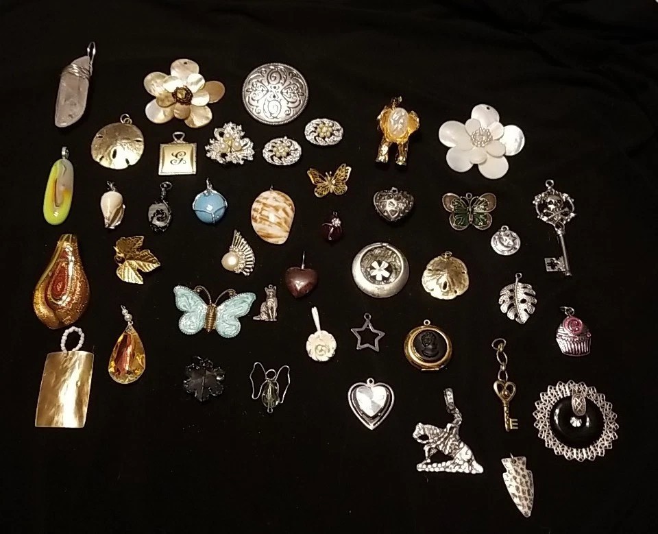 This product is a set of 43 multicolored charms and pendants, suitable for jewelry making or collecting. The charms are made from various metals and types of materials, offering a diverse selection for creative projects. These charms are non-handmade and ready to be used in crafting and design endeavors. let me know if you are buying multiple items i will combine shipping to save you money.