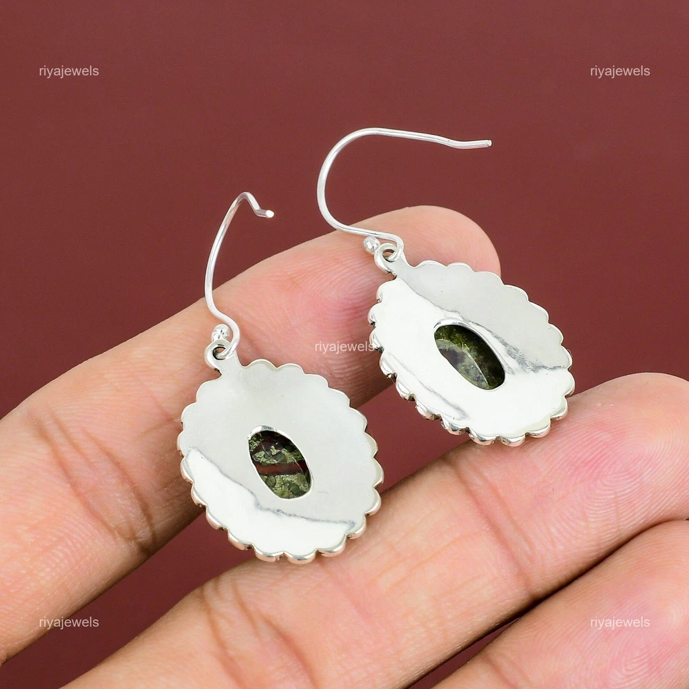 Note : Due to the natural formation of this gemstone. Slight variation in design and color are to be expected. Welcome to Riyajewels Natural Dragon Bloodstone Gemstone Drop/Dangle Earrings 925 Silver For Girls Handmade Earrings, Sterling Silver Earrings, Dragon Bloodstone Earrings, Handcrafted Earrings SKU : PE-1654 Gemstone : Dragon Bloodstone Stone Shape : Oval Metal Purity : 925 Sterling Silver Length : 43 Millimetres Width : 20 Millimetres Silver Jewelry is a popular choice for many people due to its unique properties and numerous benefits. Here are some of the key properties and benefits of wearing silver jewelry: Properties: Durability: Silver is a durable metal that can withstand regular wear and tear. Malleability: Silver is highly malleable, which means it can be easily shaped and molded into various designs. Conductivity: Silver is an excellent conductor of heat and electricity. Anti-bacterial: Silver has natural anti-bacterial properties, which can help prevent the growth of harmful bacteria. Benefits: Aesthetic appeal: Silver jewelry is known for its beauty and versatility, and can be worn with a variety of outfits and styles. Hypoallergenic: Silver is generally hypoallergenic, which means it is unlikely to cause an allergic reaction in most people. Healing properties: Some people believe that wearing silver jewelry can help with various physical and emotional conditions, such as arthritis, anxiety, and depression. Spiritual significance: Silver has been used in various cultures for its spiritual and symbolic significance, and wearing silver jewelry can help to connect with these traditions. Investment value: Silver is a precious metal that retains its value over time, and investing in silver jewelry can be a smart financial decision. Overall, silver jewelry offers a unique combination of beauty, durability, and benefits, making it a popular choice for people around the world. For Mother's Day Gift For Father's Day Gift For Promise For Valentine' Day For Halloween Party For Christmas Day Gift For New Year Party For Mom For Her If you can't find the information you need or need some advice for your design? Feel free to contact us. We are fast to reply :) All our work is made by hand with Love and Care in our workshop Thank you so much for visiting and hope you enjoy shopping with us Riyajewels is dedicated to providing customers with high-quality sterling silver jewelry. As a manufacturer of handmade jewelry, we offer an extensive range of silver gemstone jewelry that demonstrates our exceptional craftsmanship. We are skilled in adorning gemstones to complement any style, and we give you the freedom to design your own jewelry collection with dazzling, natural, and genuine gemstones. Our talented craftsmen carefully handcraft each jewelry piece, ensuring that it is unique and made with authentic gemstones.