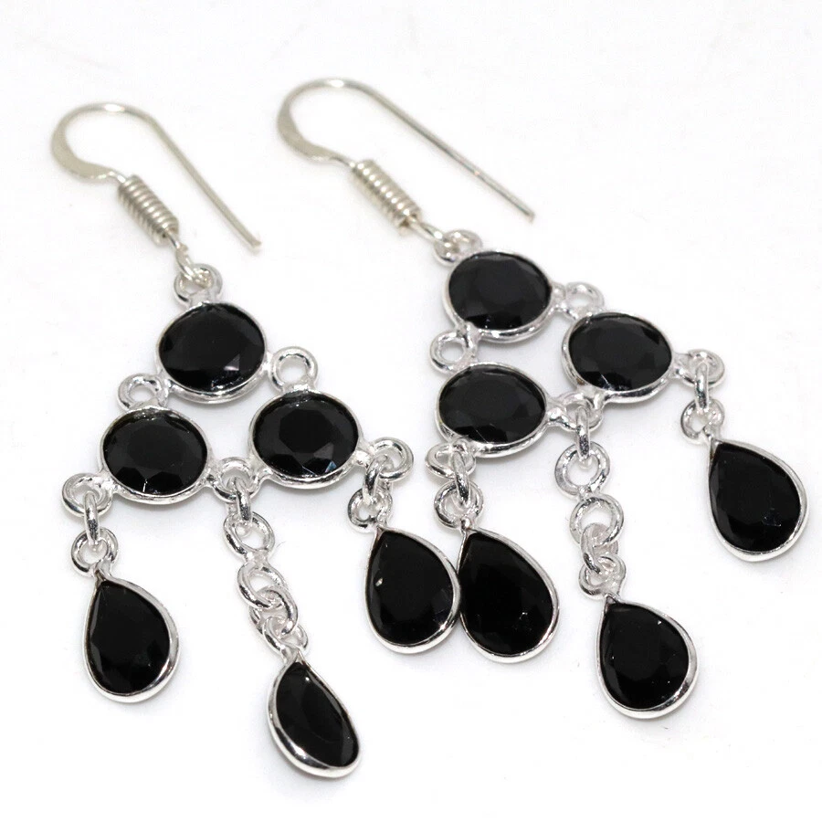 Pendientes largos enchapados en plata 925 facetados de ónix negro 2,2" regalos de San Valentín JW