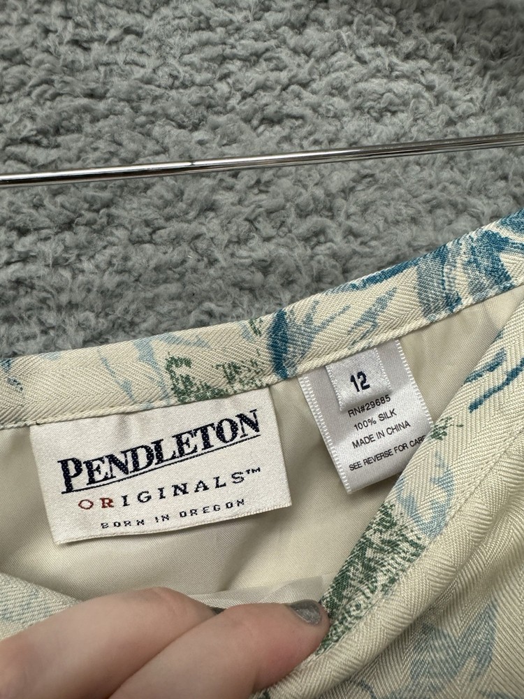 The Pendleton Size 12 Floral Black & White Skirt is a stylish and versatile piece perfect for a business occasion or everyday wear. This long, straight & pencil skirt features a black and white floral pattern on a canvas fabric, making it a 90s-inspired and preppy addition to your wardrobe. The skirt is lined for added comfort and has a mid-rise fit, with a convenient zipper closure for easy wear. Made in the United States, this skirt combines polyester and rayon for a high-quality and fashionable look that will stay fresh throughout the fall and spring seasons.