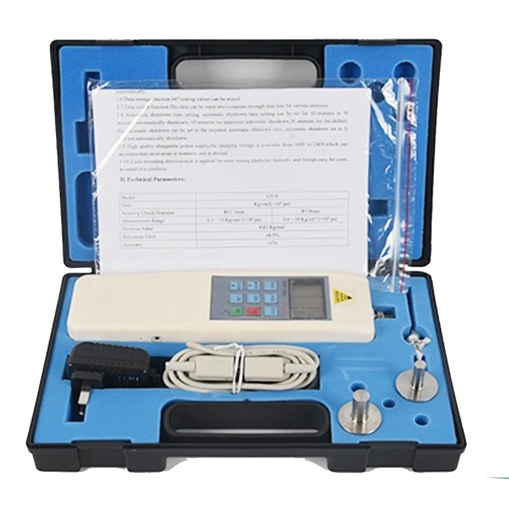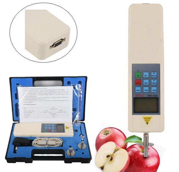 Fruit Firmness Penetrometer Hardness Tester Digital Fruit Durometer Data Storage Feature: 1.Can store 896 peaks of data .The LED show the peaks of data,and get ride of the data . 2.Can output data,analyse the data by connected with computer. 3.With digital peak value holding function,hold the peak value for 2 seconds and the peak value will be automatically canceled . 4.Green environmental-protective:If you do not operate the machine after 10 seconds, the machine will be shouts off automatically. 5.High-quality Charging power supply. 6.Charging power range : 100V-240V 7.Working conditions: no source and corrosive medium. Sp ecification: * Measurement Range: 0.2 - 10Kg/cm2 (X 105 pa); 0.4 - 20Kg/cm; (X 105 pa) * Division Value:0.01 - 10Kglcm; 0.01Kg/cm2 * Seaming Chuck Diameter: 1# φ11.1mm; 2# φ7.9mm * Depth Pressed by Seaming Chuck: 10mm * Indication Way: 土 1% * Indication error::±0.5% * Unit:Kg/cm2 (×105 Pa) * Output interface:Rs 232 nine-hole socket. * Power: rechargeable batteries charger (charging voltage 100V-240V ) * Sensor structure:S-type high-precision sensors (inside) * Working temprture:5°C~35°C * Transport Temperature:-10°C~60°C *Humidity:15%~80%RH Working conditions: No hypocenter and corrosive medium * Weight:(About)0.6kg * Size:230×66×36 (mm ) * lndication Way: Digital