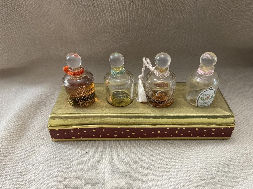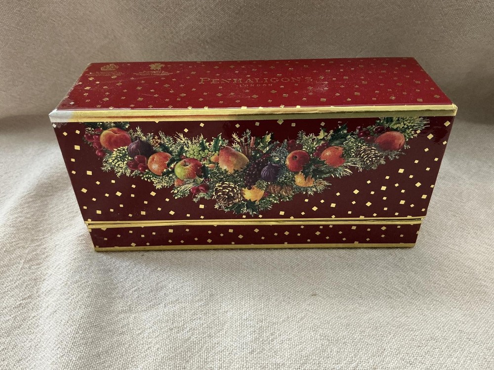 New Penhaligon’s Quercus eau de toilette, 0.5 fl oz (15ml). I’m including the box of used Penhaligon’s ladies perfumes- Elizabethan Rose is empty, Lily of the Valley has a very small amount. I can’t tell which is which of the other 2 bottles- 1 is half full, and 1 is full.