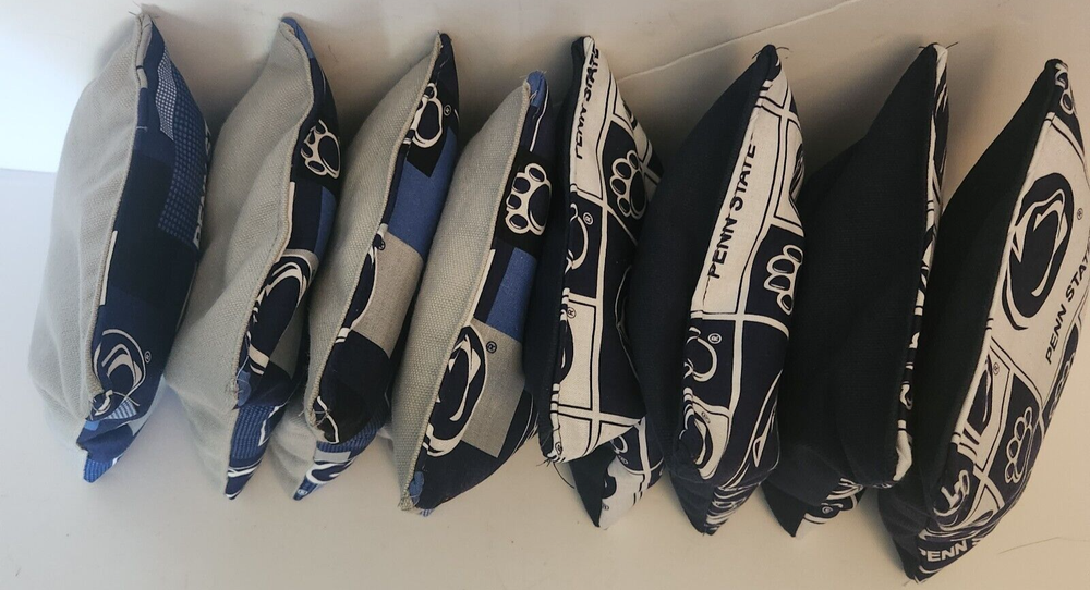 You are bidding on a set of Penn State University cornhole bags. These bags are made of duck cloth, 6" x 6", triple stitched, and filled with 2 cups (14-16 ounces) of corn. This set includes 8 bags: 4 navy duck cloth bags with the front faced with Lions fabric and 4 gray duck cloth bags with the front faced with Lions fabric. I have been making cornhole bags since 2005 and have many happy customers. So bid with confidence that you are receiving quality merchandise. I ship priority so you'll receive your bags in 1 - 3 days. Logoed bags are made of licensed NCAA material, but are not licensed by the NCAA. They are hand crafted and resold under rights granted by the first sale doctrine. We are not affiliated with The Licensed Company in any way.