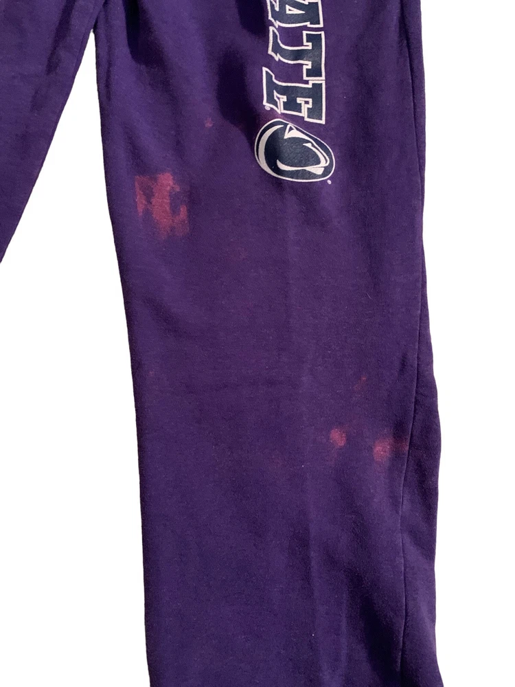 Penn State Unisex Sweatpants Size: XL Inseam-30". Waist (relaxed)28'. Rise- 13.5". Features & Accents: Purple, Heavyweight, Elastic Waist with Drawstring, Pull on, Wide Leg, Spell out of Penn State & Logo on leg. Condition. Pre owned with minor discoloration to leg area. Please see photos. Smoke Free Home. Same day shipping if purchased by 3:00 PM, EST. International Sales Ship through Ebay International Shipping Program. Free Returns. We truly try to disclose all information on items we list. However if we miss something, please contact us before leaving negative feedback and allow us to resolve the problem or issue a returns. Your choice. Thank you.