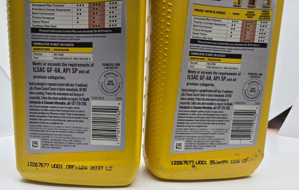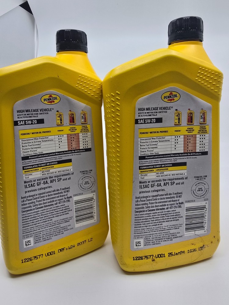 Lot of 2 Pennzoil High Mileage Motor Oil bottles. SAE 5W-20 viscosity. Each bottle is 1 Quart. Items are new and unused. Minor storage wear on bottles from shelf storage. See photos for details. Stored indoors. Ships carefully packaged.