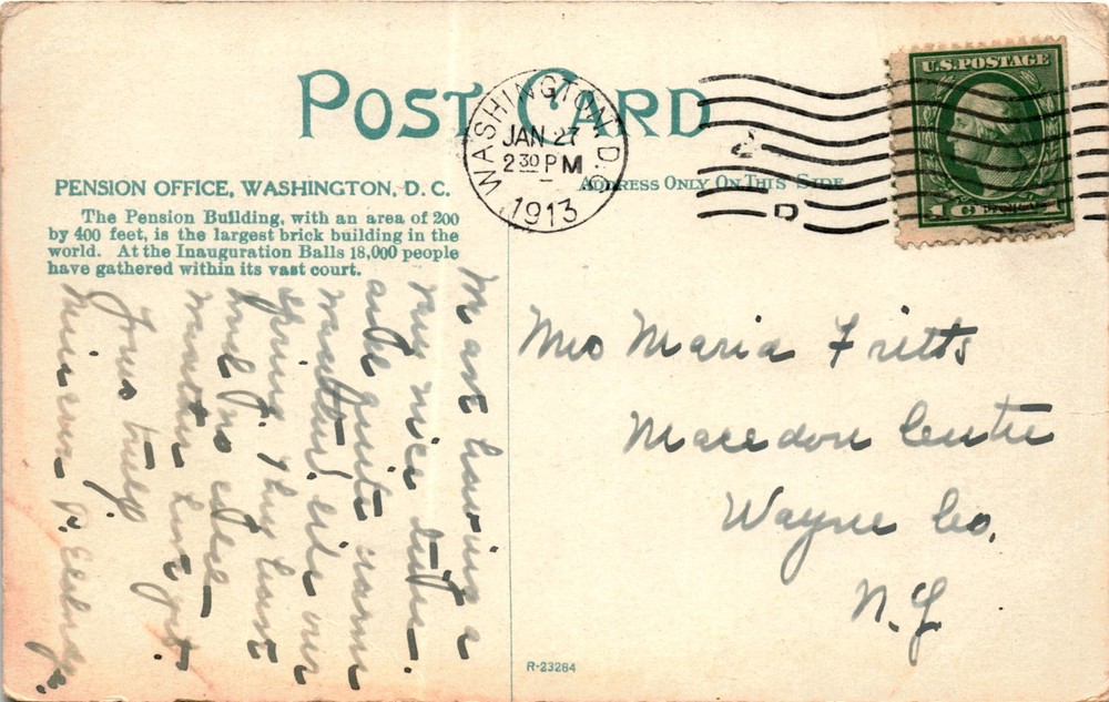 MAKE AN OFFER. THE MORE YOU BUY THE BETTER DEAL I WILL ACCEPT The postcard features an image of the Pension Office in Washington, D.C. The Pension Building, with dimensions of 200 by 400 feet, is noted as the largest brick building in the world. It has a vast court where Inauguration Balls have been held, attracting up to 18,000 people.