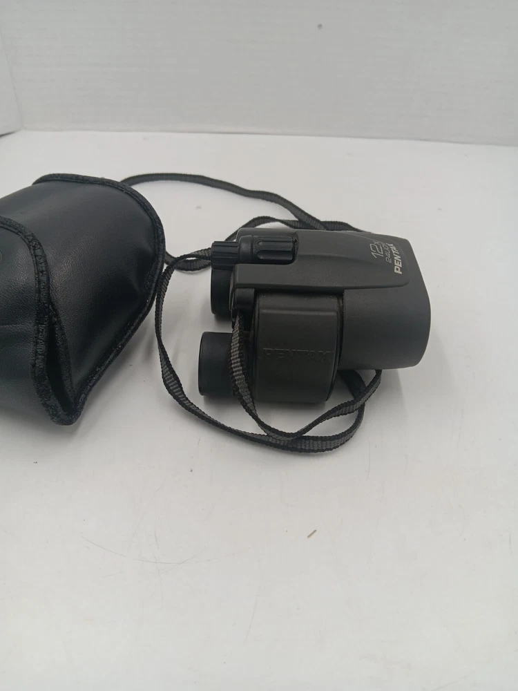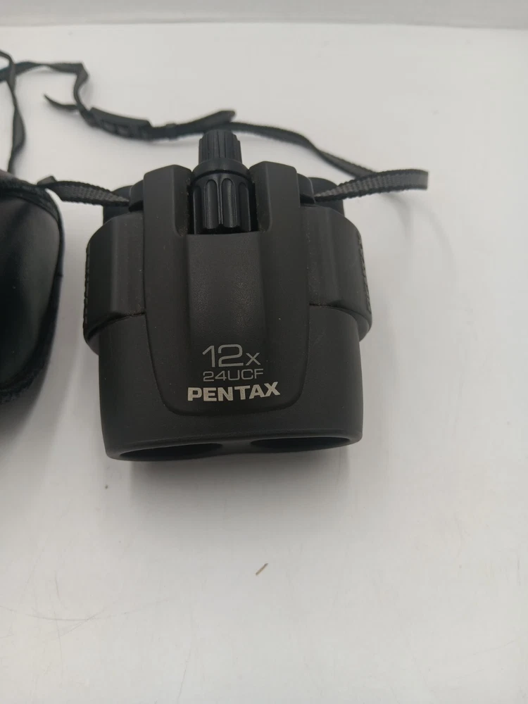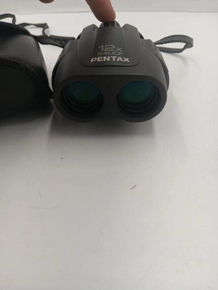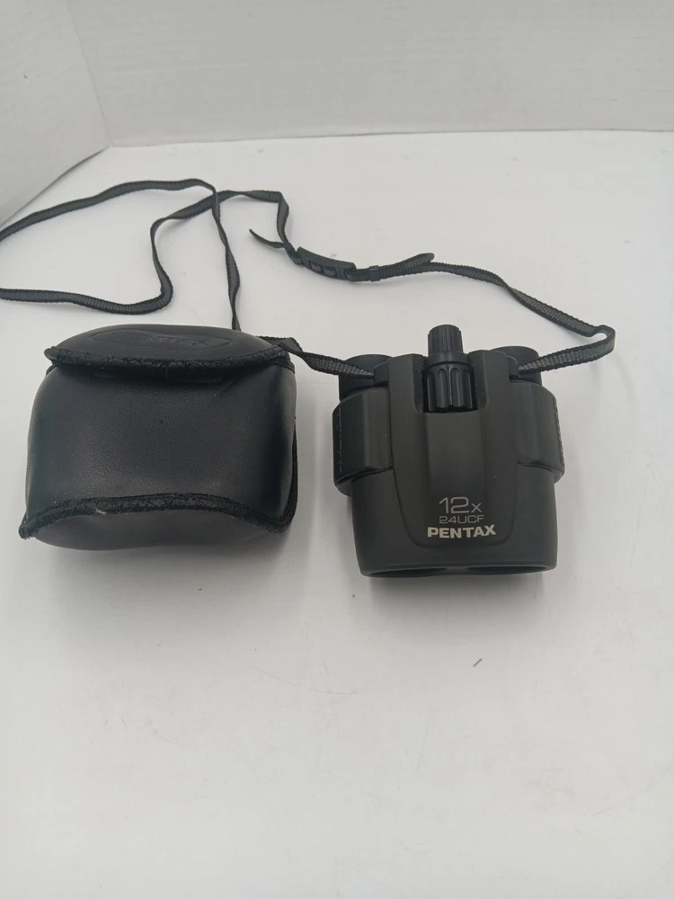 Get ready for your next outdoor adventure with these Pentax 12 X 24 5 Degree Binoculars. With a compact and rugged design, these black binoculars are perfect for hunting, birding, and general purpose use. The coated lenses provide clear and crisp views, while the 12x maximum magnification allows you to get up close to your subject. Made in Japan, these binoculars feature a 24mm objective lens diameter and are built to withstand tough conditions. The collapsible design makes them easy to store and transport, and the 5 degree adjustable viewfinder allows for easy and accurate viewing. Whether you're exploring the great outdoors or just need a reliable pair of binoculars, these Pentax binoculars are a great choice. Inventory Sku: AA