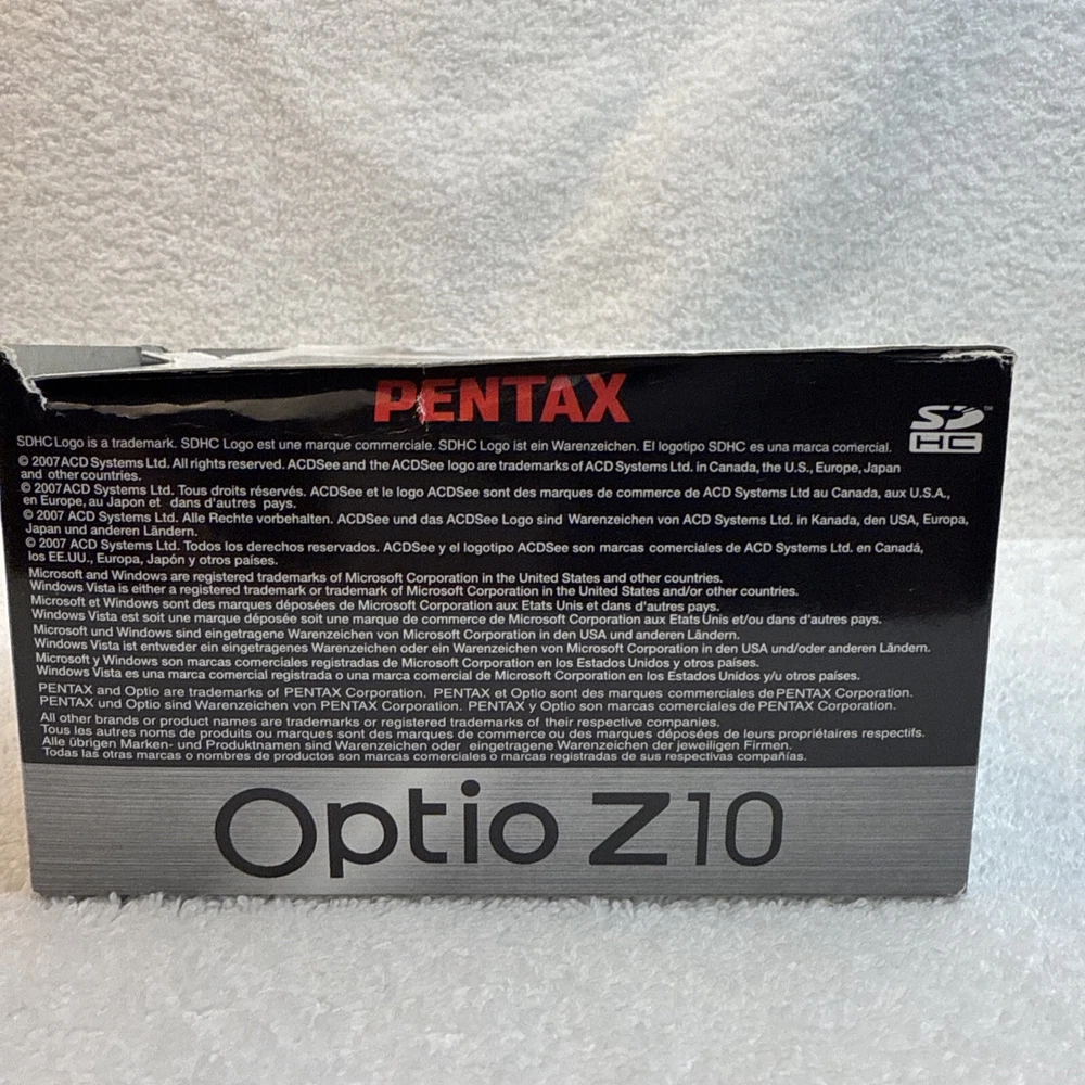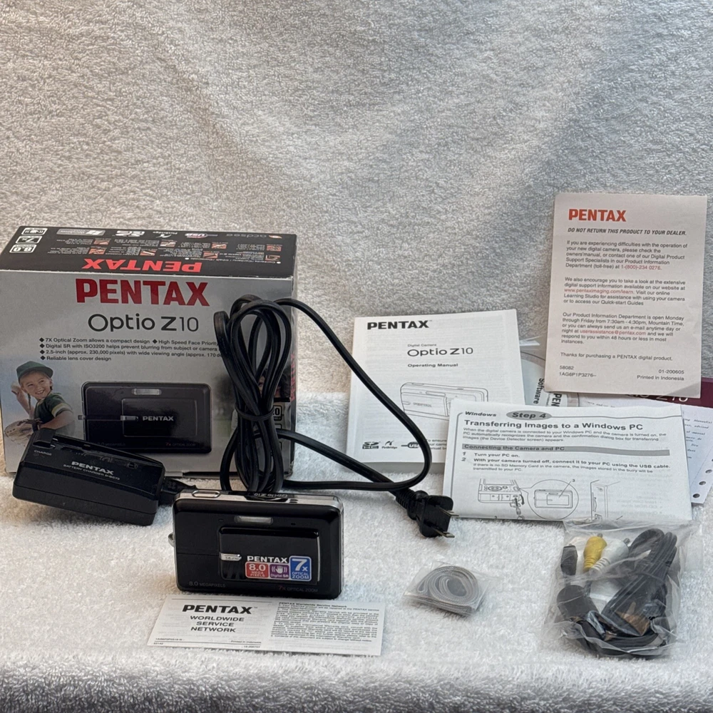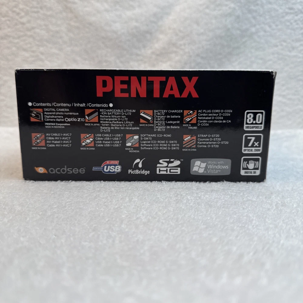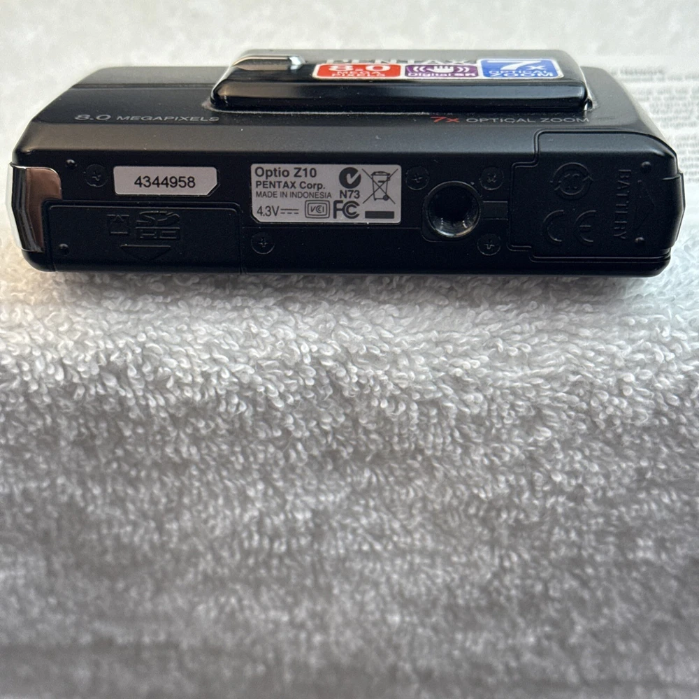 Digital Zoom: 7x Model: Pentax Optio Z10 Brand: PENTAX Color: Black Battery Type: Lithium-Ion Maximum Resolution: 8.0 MP Optical Zoom: 7x Series: Pentax Optio Type: Ultra-Compact