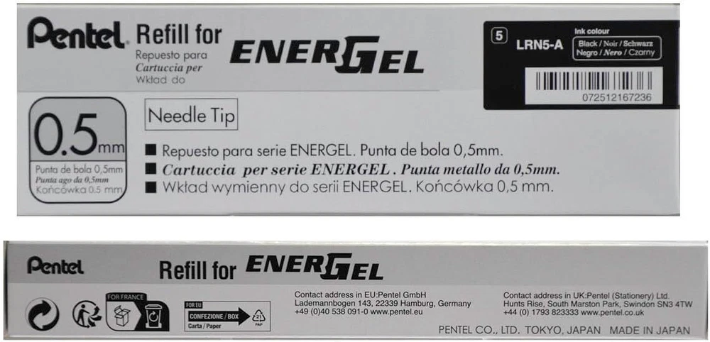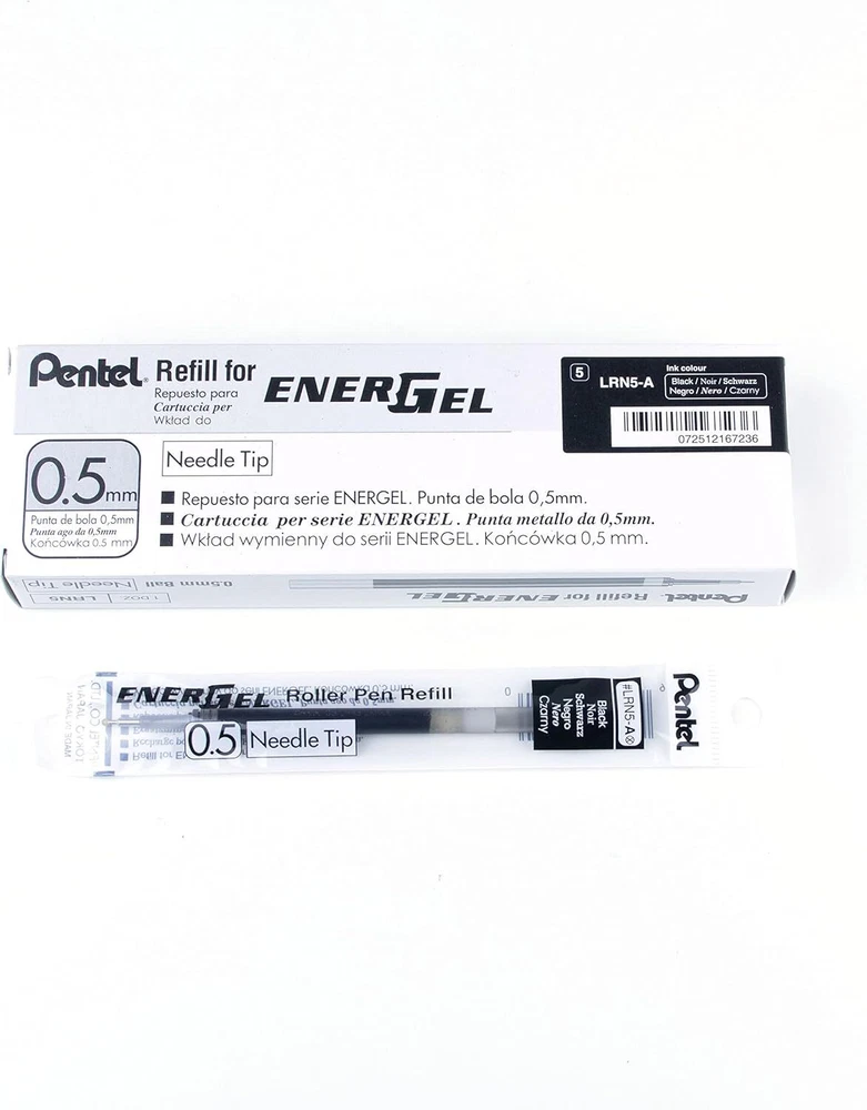 Pentel Refill Ink for EnerGel Liquid Gel Pen, (0.5mm), Fine 0.5mm, Black Product Details Manufacturer: Pentel Brand: Pentel Item Weight: 0.106 ounces Product Dimensions: 7.13 x 1 x 2.25 inches Item model number: LRN5-A Is Discontinued By Manufacturer: No Color: Black Closure: Retractable Pencil Lead Degree (Hardness): Hb Shape: Other Material Type: Metal Number of Items: 1 Size: 0.5mm Point Type: Fine Ink Color: Black Manufacturer Part Number: LRN5-A Brand: Pentel Ink Color: Black Style: Needle Item dimensions L x W x H: 7.13 x 1 x 2.25 inches Point Type: Fine High performance ink technology combines the best qualities of liquid and gel ink for a super-smooth writing experience Liquid gel ink dries so fast even left handed writers love it - no smears, no smudges, no globs Get more precise lines using the durable needle tip Box of 12 ink refills. Ink refill for EnerGel Liquid Gel Pen (LRN5). Super-smooth ink glides across paper effortlessly. Quick-drying ink is ideal for left-handed writers. 0.5mm needle tip produces fine lines.