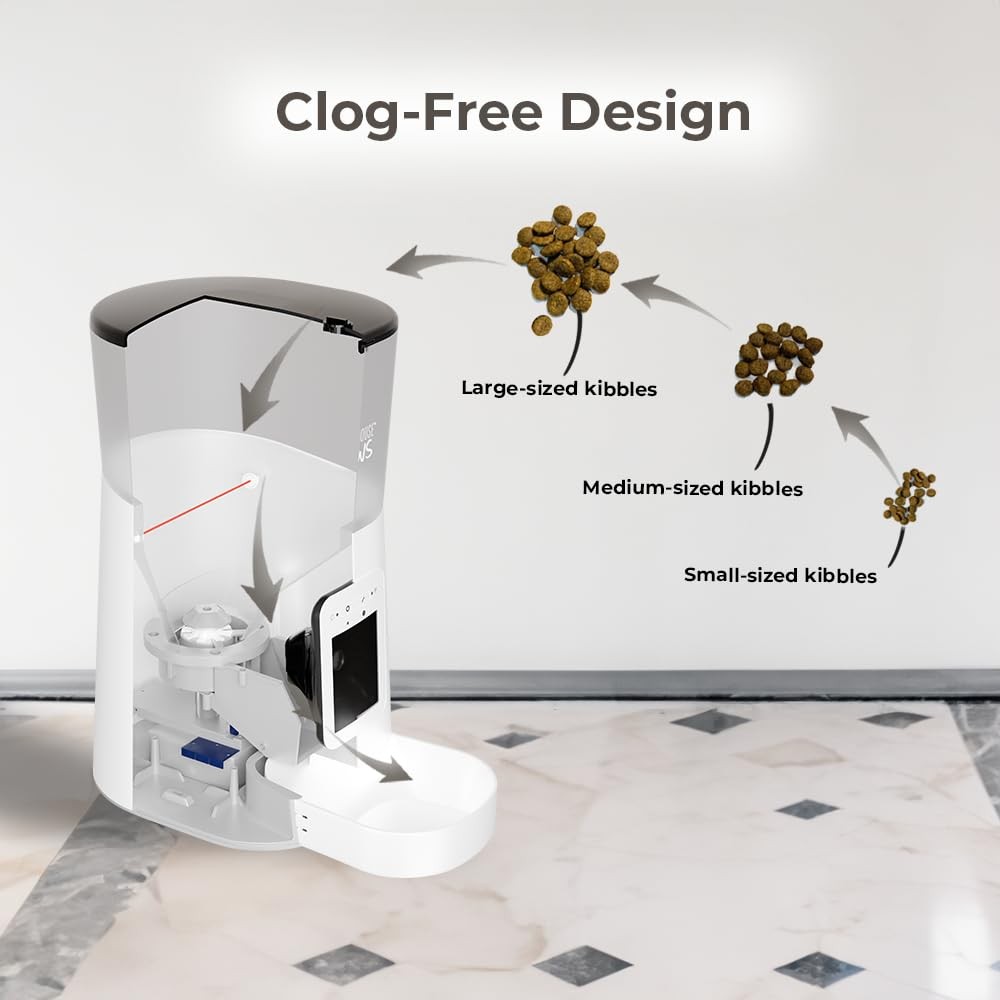 Penthouse Paws Smart HD Automatic Pet Feeder White. Designed for cats and small dogs, this feeder combines convenient automated feeding with live monitoring for complete peace of mind. With the 1080p HD camera, you can check on your pet anytime through the app, even in low light, thanks to night vision. The built-in microphone and speaker allow you to talk to your pet or record a short voice message to play at mealtime. Set up your pet’s schedule with up to 15 meals per day, and control portion sizes to keep your pet on a healthy diet. The anti-jam food and backup battery ensure reliable feeding, even during a power outage. The 6-liter capacity and twist-lock lid keep food fresh, safe. Easy to program and clean, the Penthouse Paws Smart HD Feeder makes sure your pet stays happy, healthy, and loved, no matter where you are. 1080P HD Camera with Night Vision: Monitor your pet anytime with a wide-angle 1080P HD camera and night vision. Watch live video, check feeding habits, and view your pet clearly day or night through the Penthouse Paws app. Two-Way Audio & Custom Meal Call: Stay connected wherever you are using the built-in microphone and speaker for real-time interaction. Record a 10-second voice message that plays at mealtime to help your pet feel calm and familiar. Smart App Control & Flexible Feeding: Easily schedule or manually dispense meals through the app. Program up to 15 meals per day with accurate portion control to support healthy routines and prevent overeating. Anti-Jam Dispensing with Battery Backup: Designed with an anti-jam feeding system for smooth, reliable food delivery. Backup battery support ensures your pet is fed on schedule even during power interruptions. 6L Secure Dry Food Storage: Large 6-liter hopper stores dry food safely and helps maintain quality over time. Twist-lock lid keeps contents contained, while the tinted container reduces light exposure.