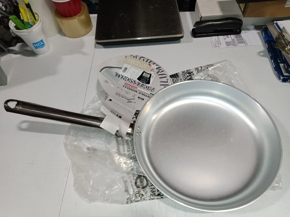 Introducing the Pentole Agnelli Aluminium Professional Radiant Frying Pan, a high-quality kitchen item designed to make your cooking experience more efficient and enjoyable. This frying pan is compatible with various stove types such as induction, electric, and gas, and has a round shape with a diameter of 15.59 inches / 32 cm. Crafted from durable aluminum material, this frying pan is built to last and is easy to clean. It also features a sturdy stainless steel handle that makes it easy to carry and manipulate. Hand wash only is recommended for this item. Made in Italy, this frying pan is a great addition to your cookware collection.