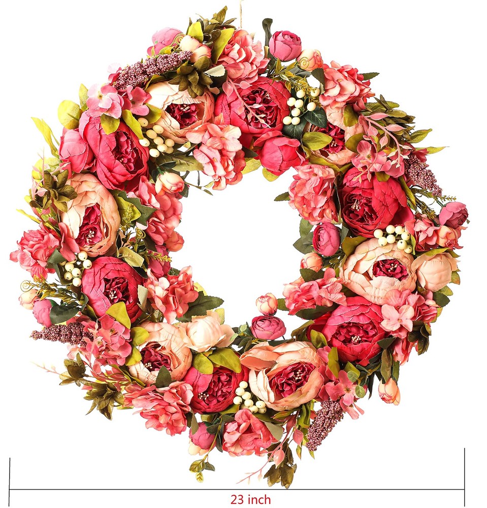 Spec: Material: Silk, fabric and rattan Size: Outside diameter: about 24"+/-0.5" Inner diameter: about 6" Large flower diameter: about 3” Small flower diameter: about 1” Thickness: 8 cm / 3" Package : 1 * Peony Wreaths 【Material】This front door wreath is a fluffy and full of vitality wreath for front door,by many different sizes of pink,little pink,dark pink,red and other colors of peony,hydrangea,eucalyptus leaves and thick grapevine base composition,inner and outer are a lot of flowers embellishment,flowers lush and beautiful,the flowers are all very securely attached,and the grapvine base is also secure and does not shed.The craftmanship very good. 【Beautify】This Large spring wreath for front door makes for an attractive entrance way.These flowers are lush and realistic.The wreath is well made and impressive.This wreath is gorgeous, It truly is chock full of peony flowers which is awesome. 【FullHand】This peony wreath is an exquisite hand-made wreath.The details and quality are our first guarantee.The quality is excellent,the shape is realistic,just like natrue.The wreath will need to be reshaped, and can be easily bent for reshaping - please separate and loosen flowering stems to achieve the desired fullness. 【Occusion】This full season wreath can be used indoors and outdoor, hant it over the fireplace and put it on your front door,wall,window.It also can be used as a candle wreath for table decoration.This wreath creates a pleasant atmosphere all year round.It is also suitable for Venlentine's day,Easter,Mother's day,Christmas day etc. 【EasyUse】The wreath is easy to use for a long time, hang it on your front door.If it is dirty, you can wipe it with a soft wet cloth to make the wreath as bright as new. No maintenance required.No watering is required.Looks plump and fresh every day.