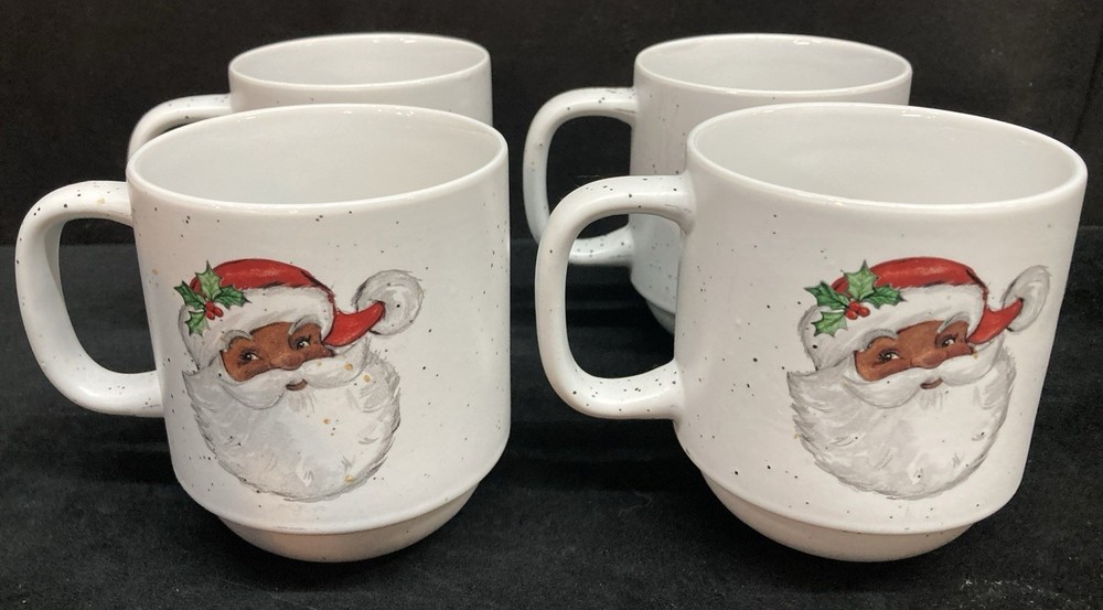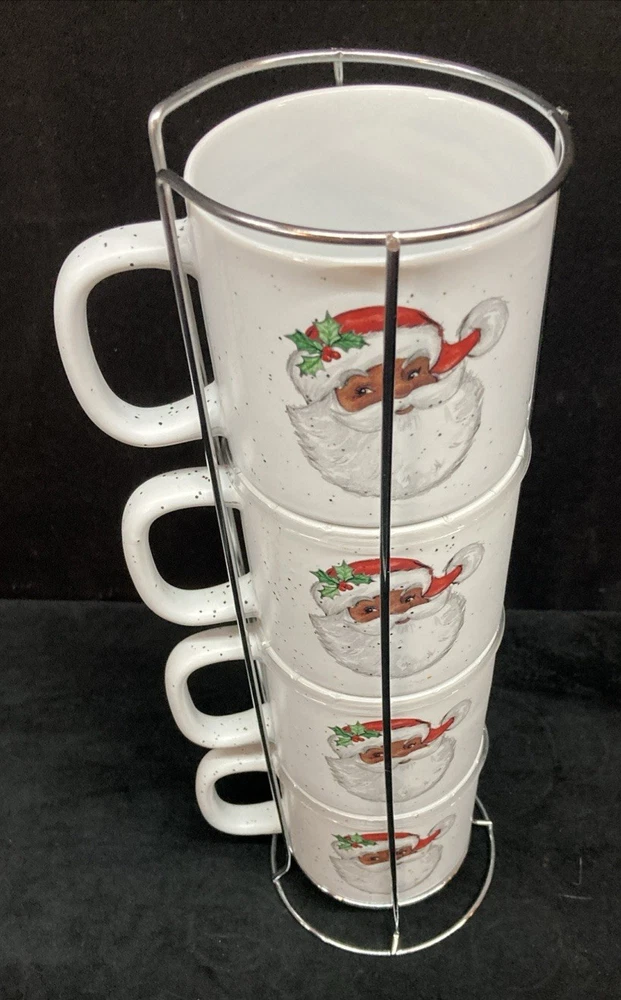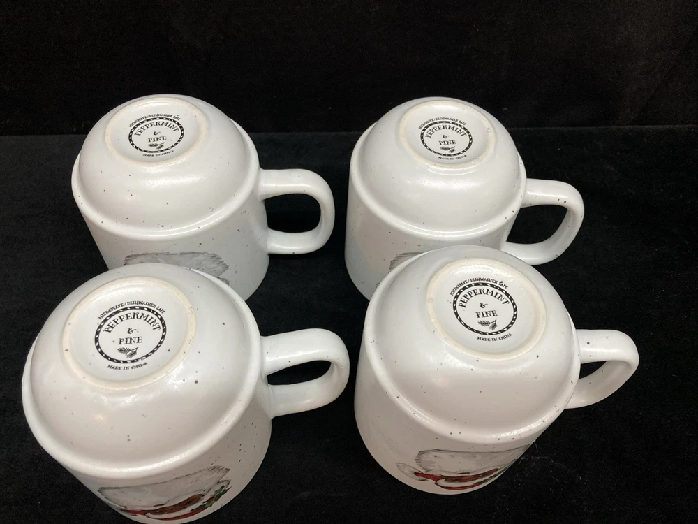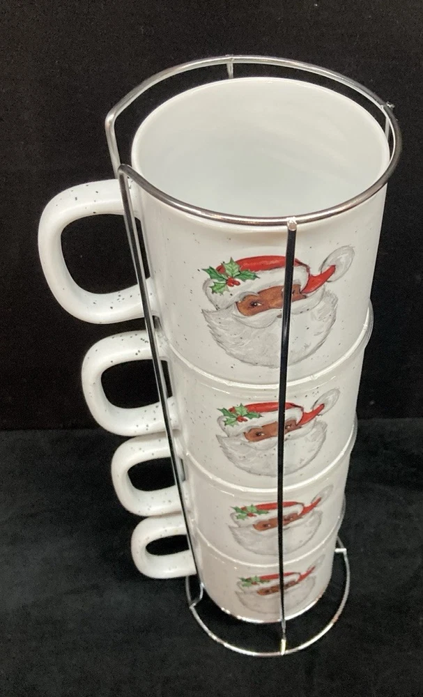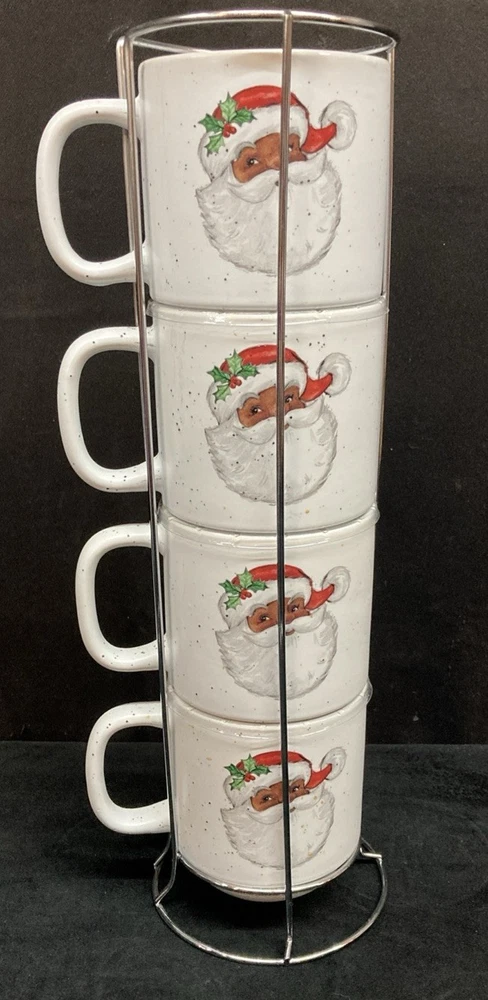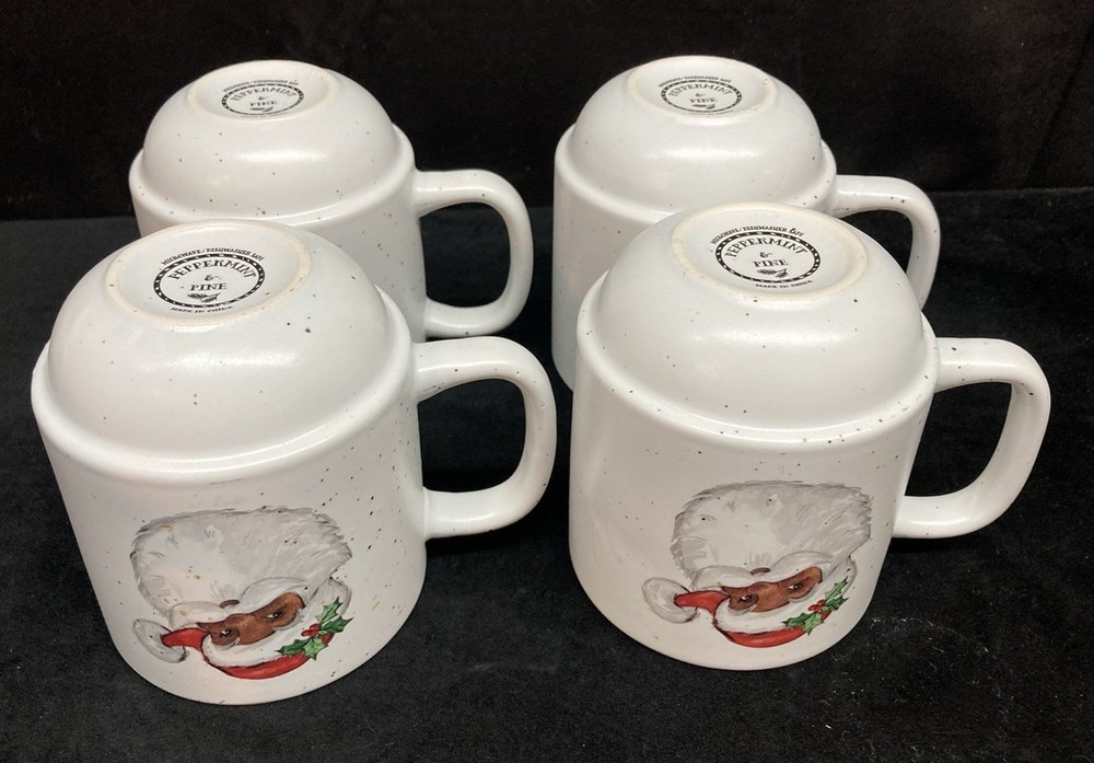 This set of four Peppermint & Pine Black Santa Stackable Coffee Mugs are a festive and charming addition to your kitchen or dining space. The set is pre-owned and comes in good, clean condition with no chips, cracks, or breaks. Each much holds 16oz. Please see pictures for details. If you any questions or concerns, please do not hesitate to contact us. Check out our other items and message us if interested in more than one listing as combining items could save you money on shipping.