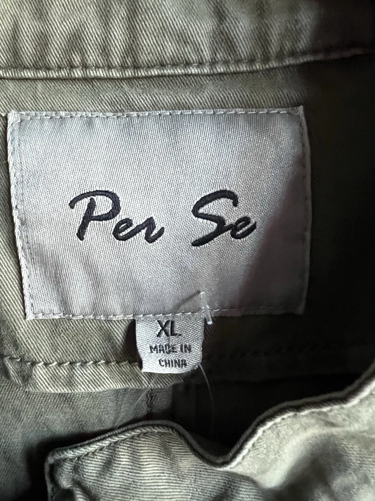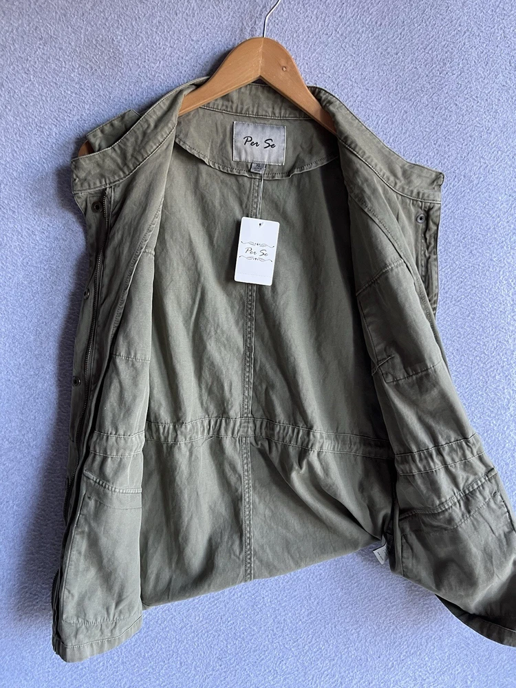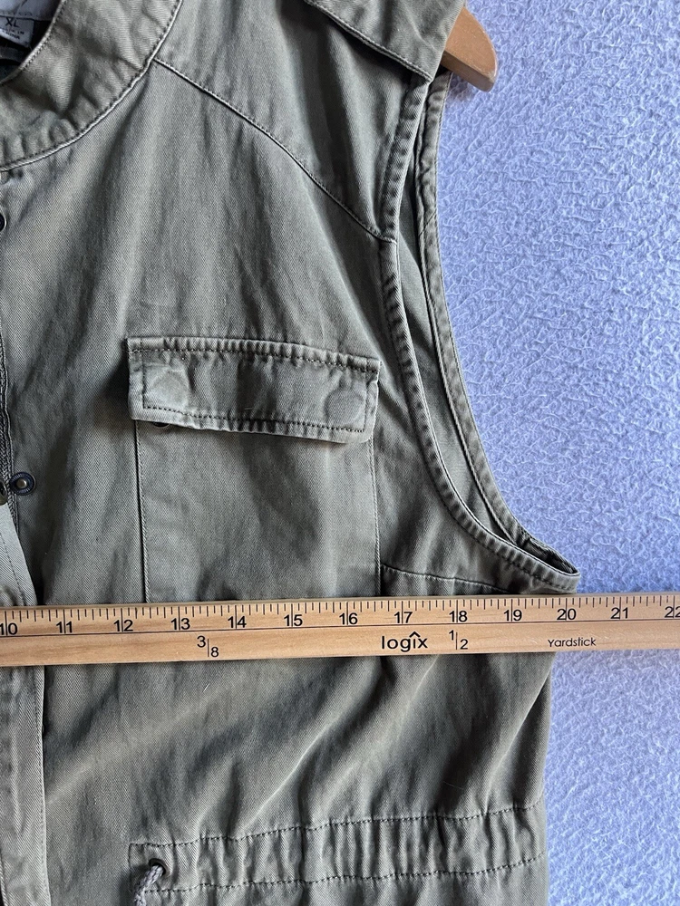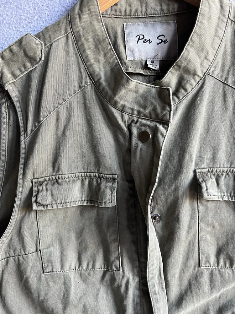 Accents: Zipper, Snap Handmade: No Pattern: Solid Closure: Snap, Zip Sleeve Length: Sleeveless Size: XL Season: Fall, Spring, Summer, Winter Vintage: No Color: Green Theme: Army, Grunge, utility, chore, work, cargo, military, hunting, fishing, safari, travel Garment Care: Machine Washable Outer Shell Material: Material Style: Basic Jacket gtin13: Does not apply Insulation Material: None Brand: Per Se Type: Jacket Size Type: Regular Fit: Regular Occasion: Casual, Travel, Workwear UPC: Does not apply Character: None Fabric Type: Twill Features: All Seasons, Full Zip, Pockets, snap, cinch waist Country/Region of Manufacture: China Department: Women