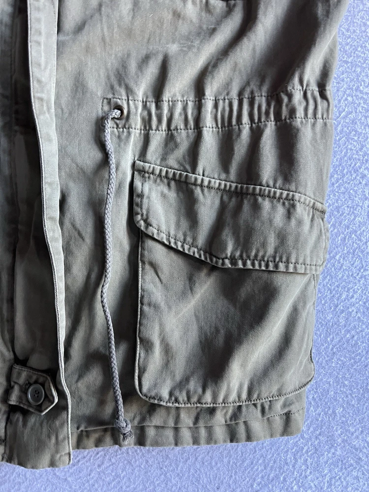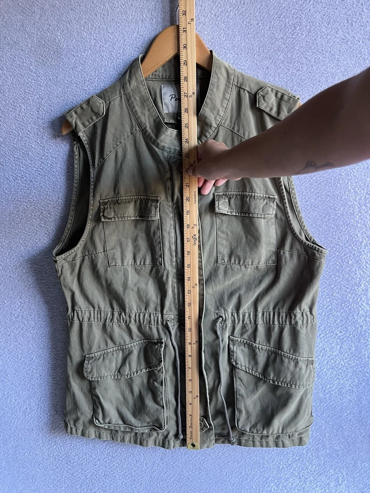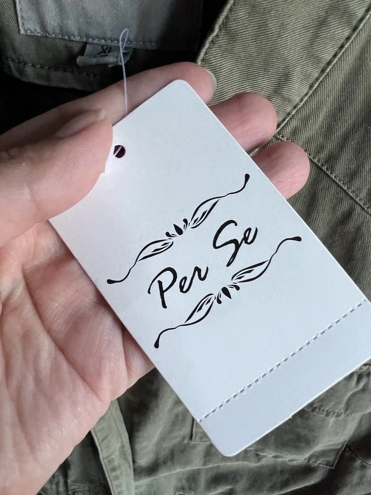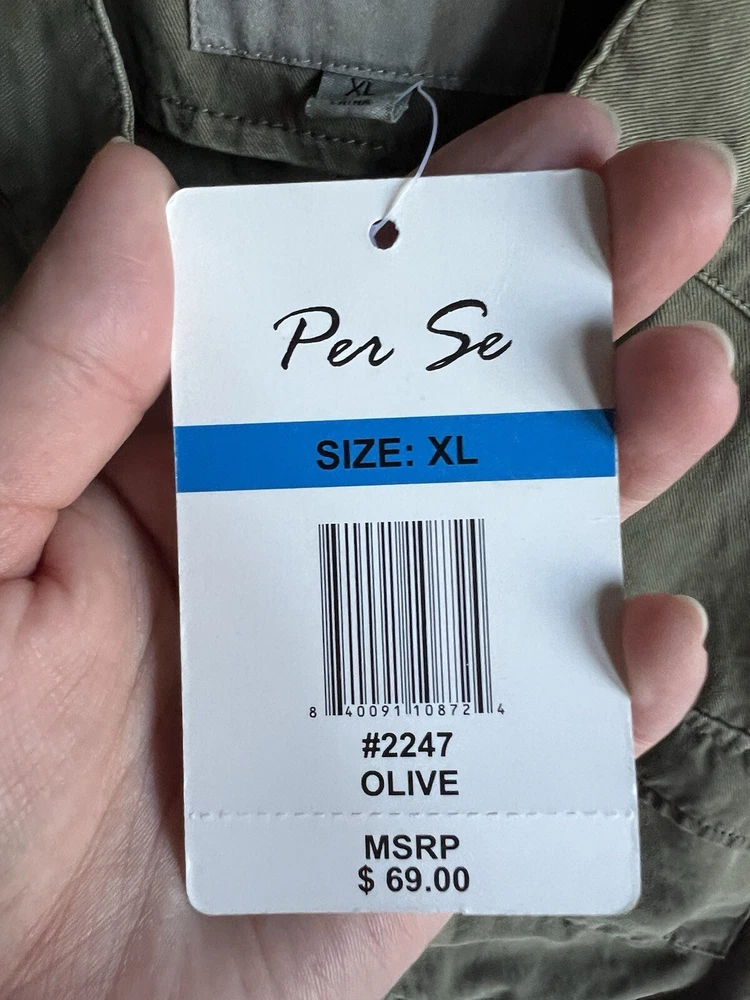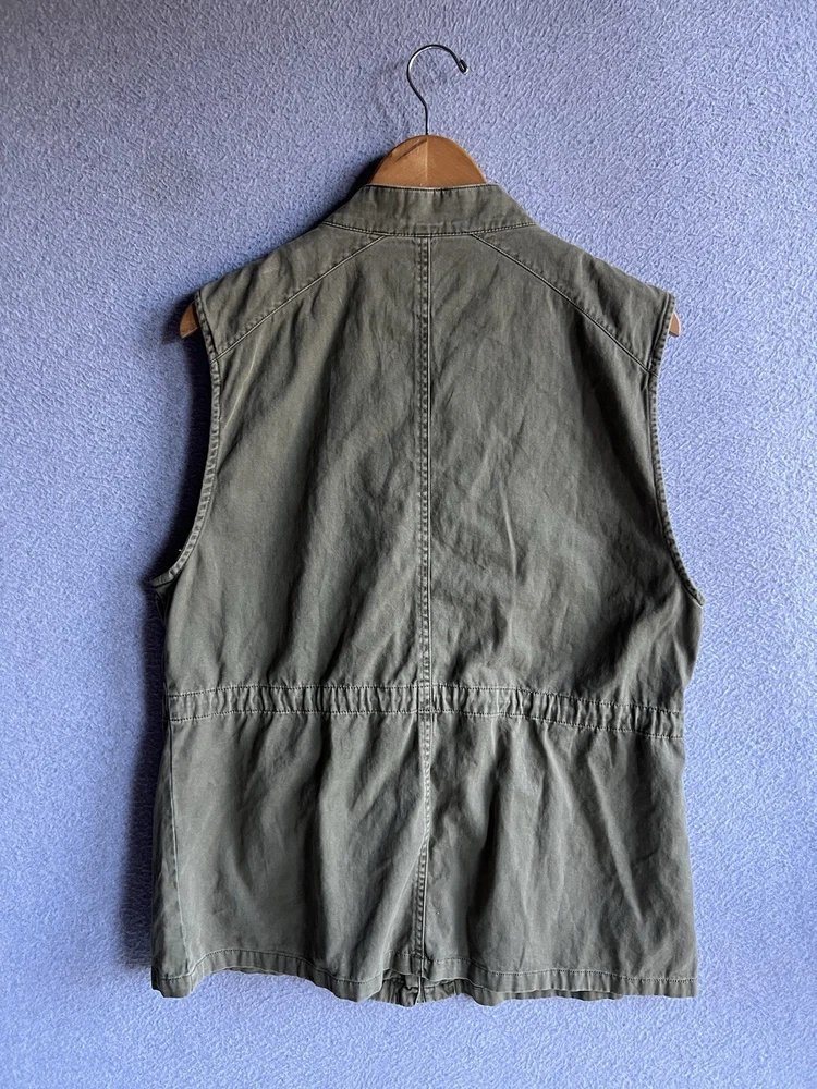 Accents: Zipper, Snap Handmade: No Pattern: Solid Closure: Snap, Zip Sleeve Length: Sleeveless Size: XL Season: Fall, Spring, Summer, Winter Vintage: No Color: Green Theme: Army, Grunge, utility, chore, work, cargo, military, hunting, fishing, safari, travel Garment Care: Machine Washable Outer Shell Material: Material Style: Basic Jacket gtin13: Does not apply Insulation Material: None Brand: Per Se Type: Jacket Size Type: Regular Fit: Regular Occasion: Casual, Travel, Workwear UPC: Does not apply Character: None Fabric Type: Twill Features: All Seasons, Full Zip, Pockets, snap, cinch waist Country/Region of Manufacture: China Department: Women