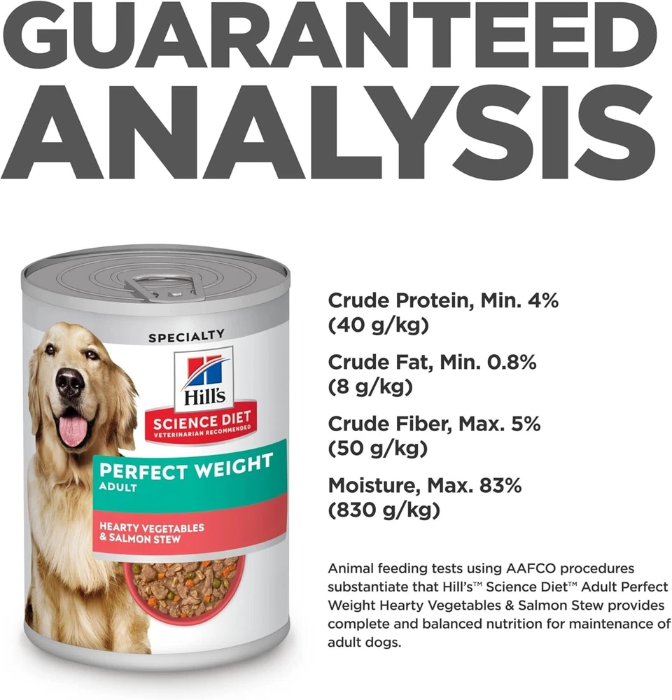 Perfect Weight, Adult 1-6, Weight Management Support, Wet Dog Food, Salmon & Vegetables Stew, oz Can, Case of 12 Safe & effective weight loss with visible results within 10 weeks Healthy weight maintenance & long lasting weight support Lean muscle support Made in the USA with global ingredients you can trust #1 Veterinarian Recommended Helping your grown dog keep a healthy weight doesn't have to be difficult. Adult Perfect Weight Salmon & Vegetable Stew is breakthrough weight management nutrition with clinically proven technology for healthy weight maintenance and long-lasting weight support in your adult dog. Over 70% of dogs lost weight within 10 weeks when fed this dog food made with natural ingredients. This premium canine recipe is also a great source of high-quality protein to support lean muscle in your dog.